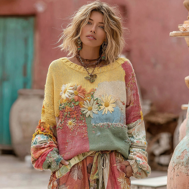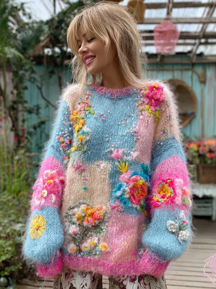 Women's Floral Embroidery Patchwork Art Cozy Knit Sweater