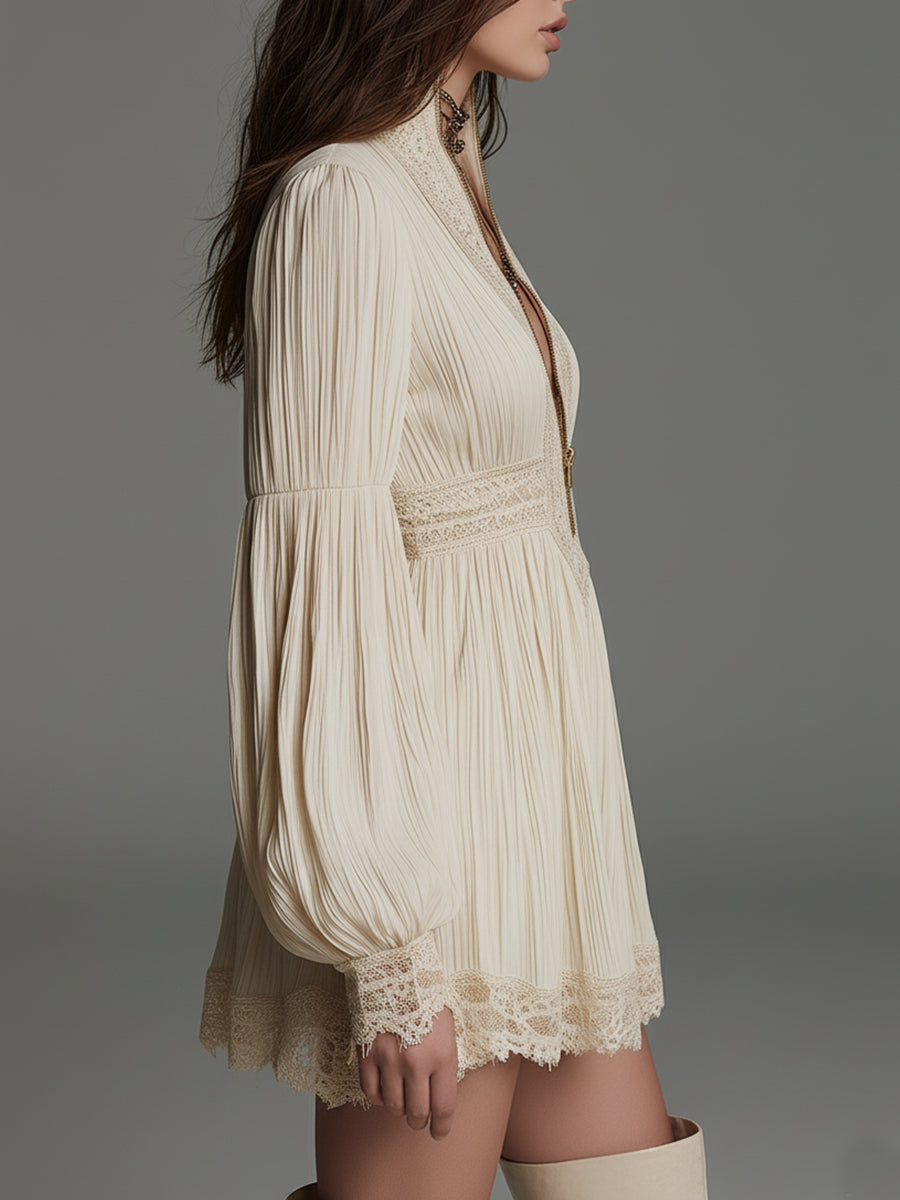 Bohemian Style Stand-collar Pleated Chiffon Mini Dress With Lace Trim