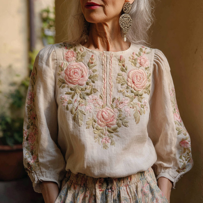 Vintage Rose Floral Embroidery Long Sleeve V-neck Shirt
