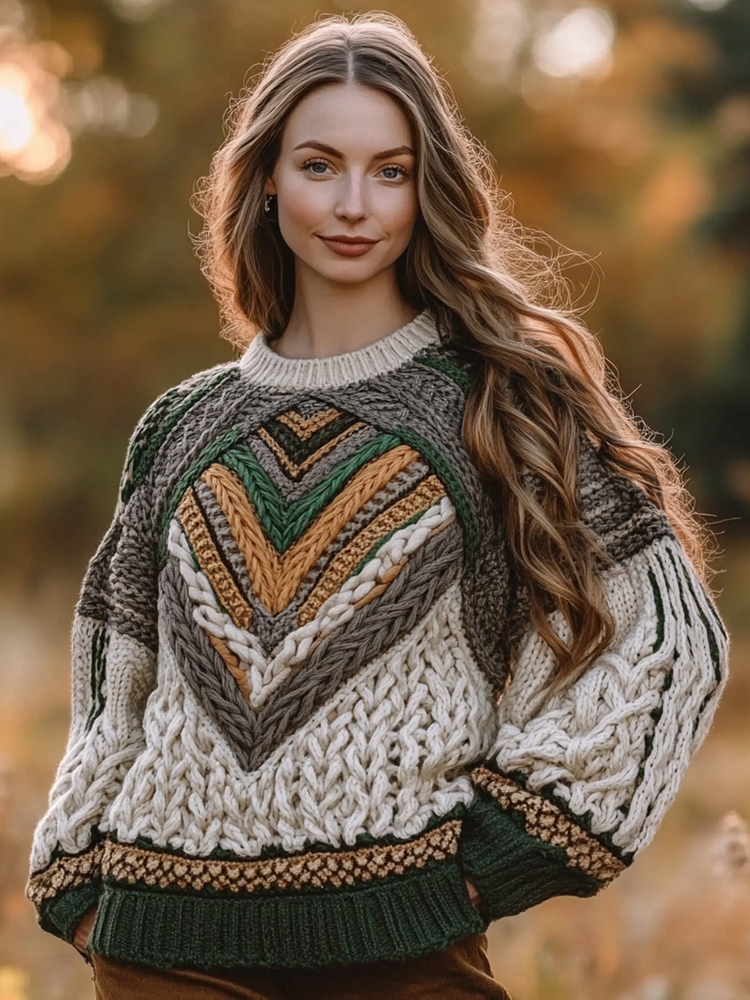 Women's Vintage Floral Patch Art Chunky Knit Warm Crew Neck Sweater