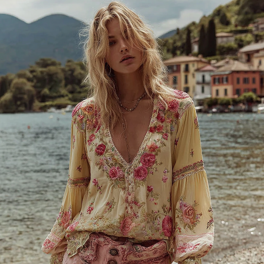 Women's Vintage Floral Stitching V-neck Shirt