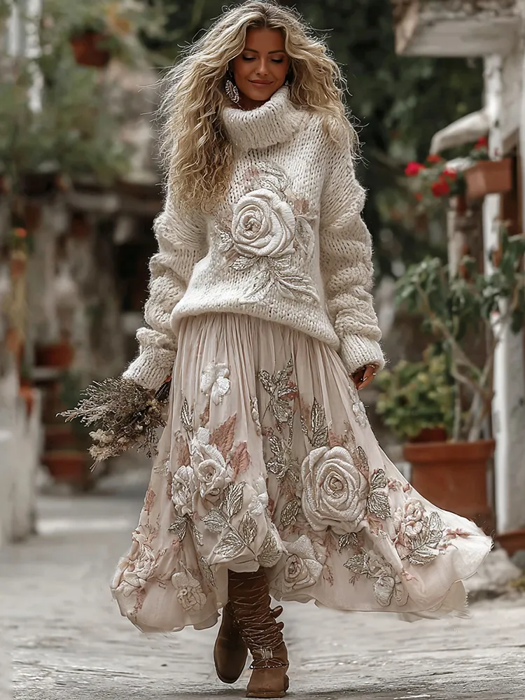 Vintage Rose In Gradient Yellow Art Cozy Knit Turtleneck Sweater And Linen Skirt Two-piece Set