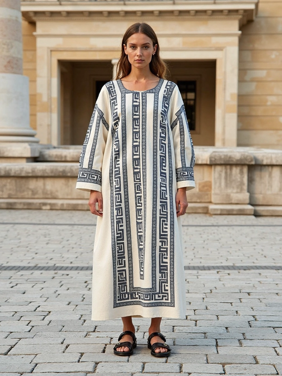Vintage Classic Greek Key Crew Neck Cotton Blend Mixi Dress