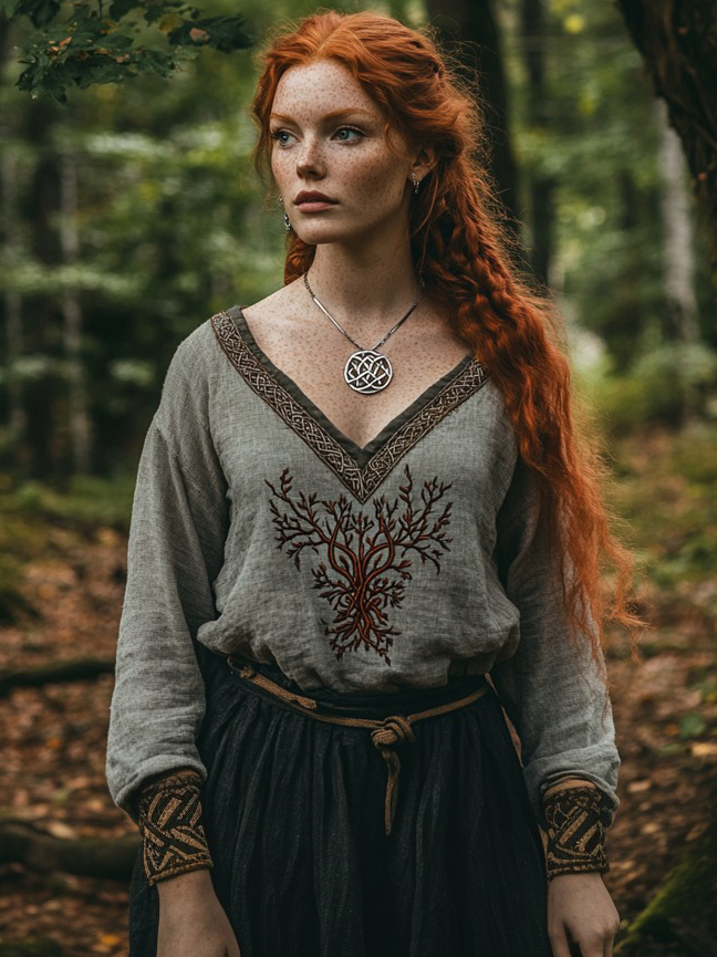 Tribal Viking Life Of Tree Embroidery Cotton And Linen V-neck Loose Shirt