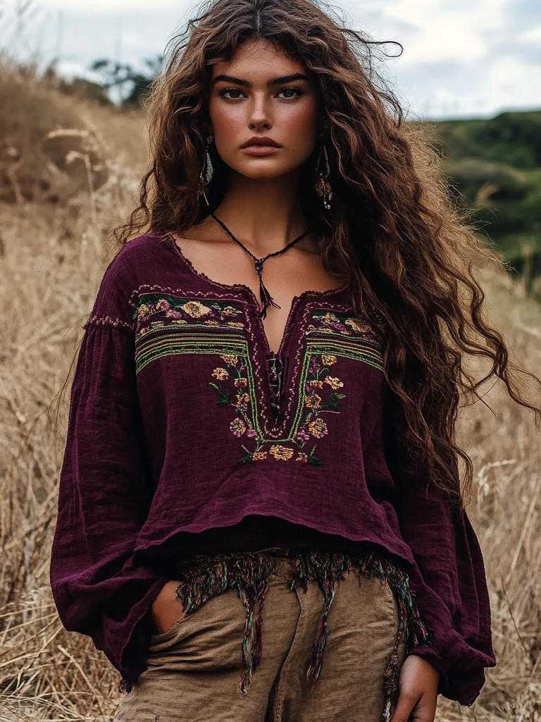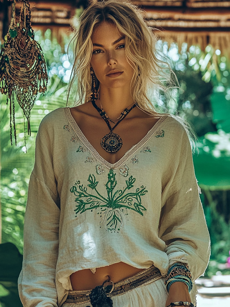 Vintage Bohemian Embroidered Linen V-neck Shirt