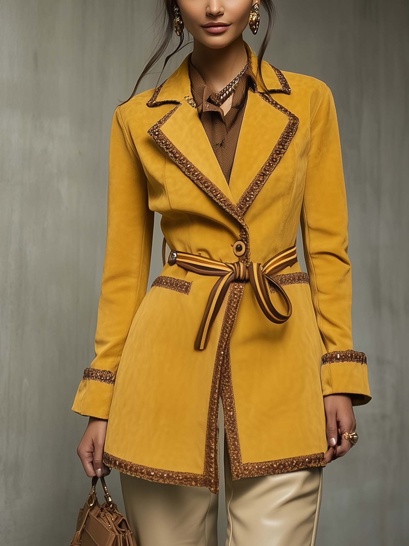 Yellow Faux Suede Coat With Brown Fashion Webbing