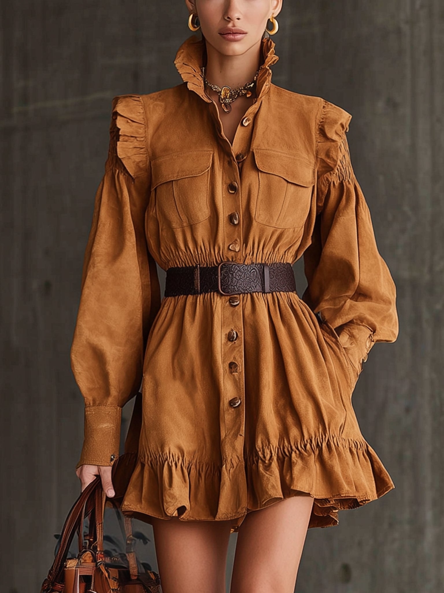 Brown Suede Ruffle Trimmed Belted Long Sleeve Mini Dress