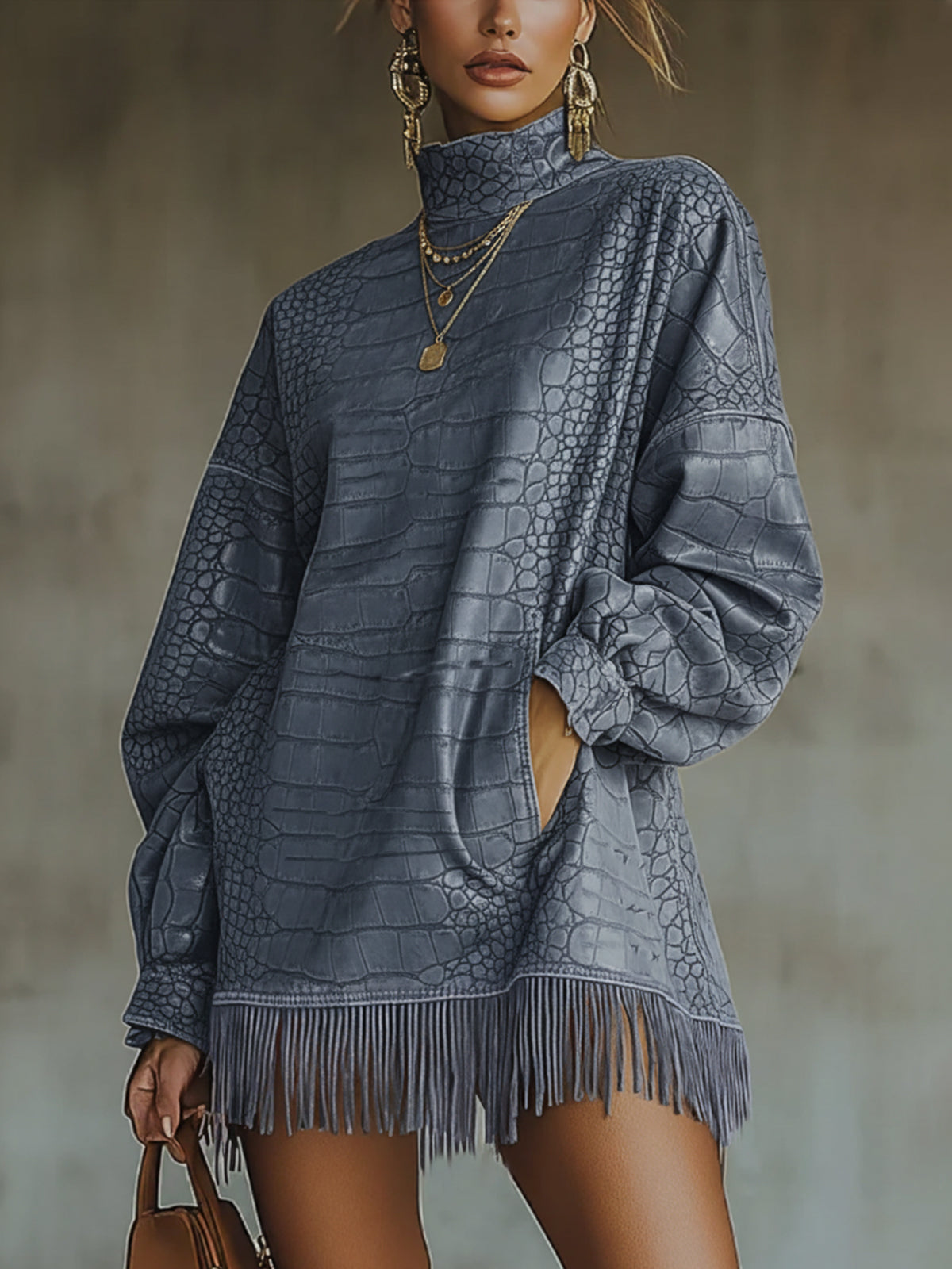 Blue Crocodile-Textured Fringed High Collar Mini Dress