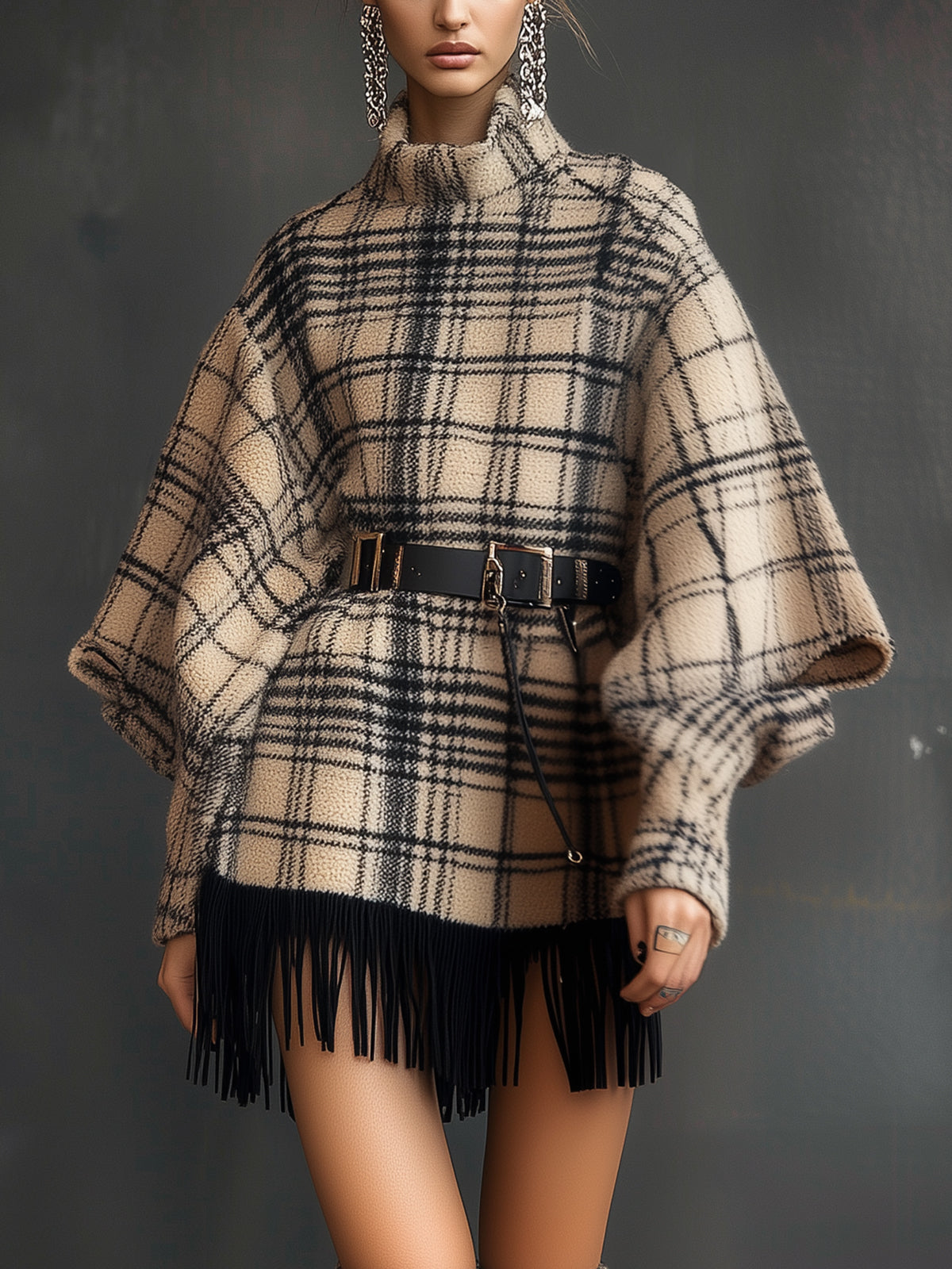 Plaid Blend Oversized Dress With Fringe And Belt