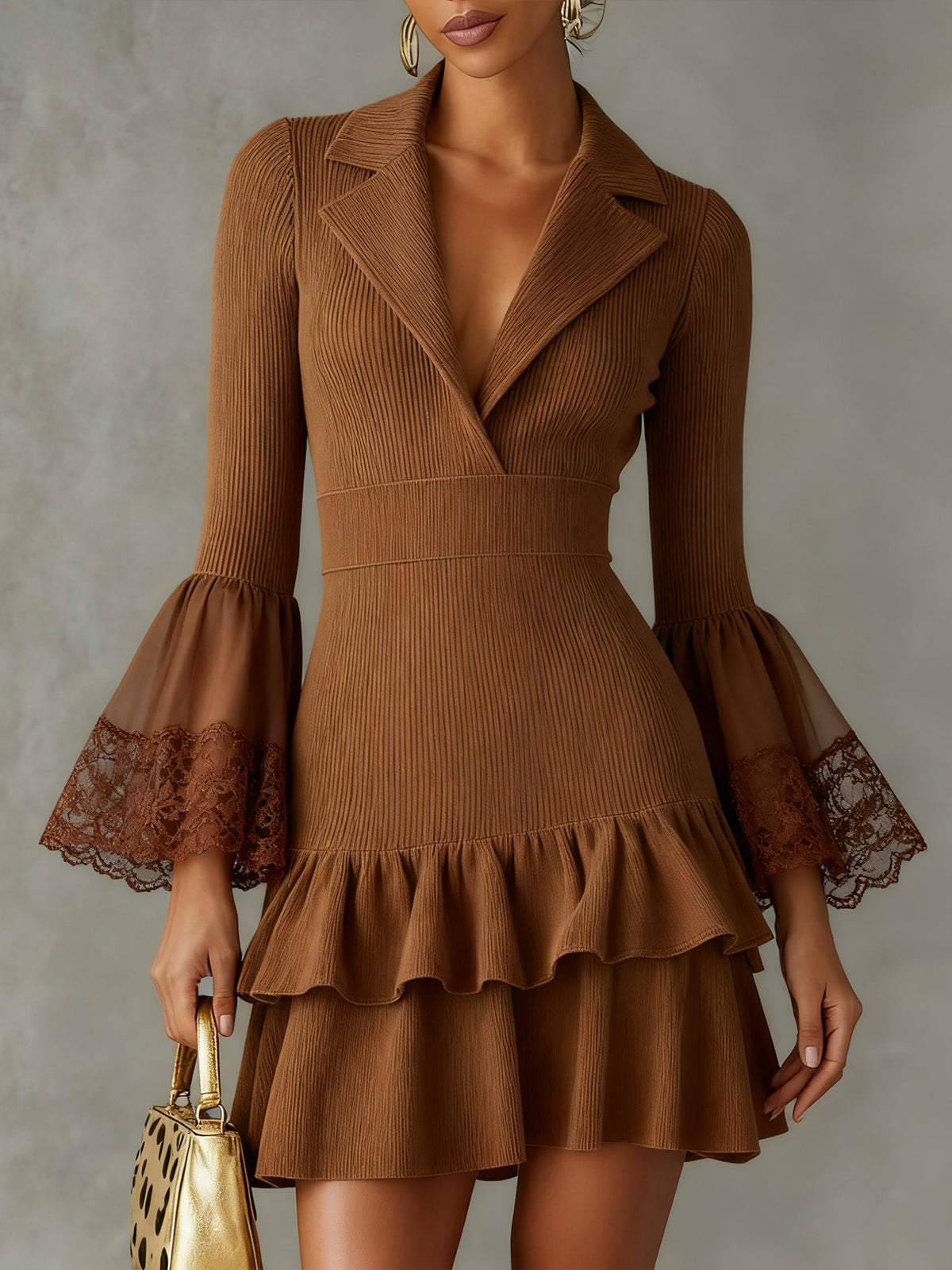 Brown Knit Mini Dress With Lace Cuffs And Ruffled Hem