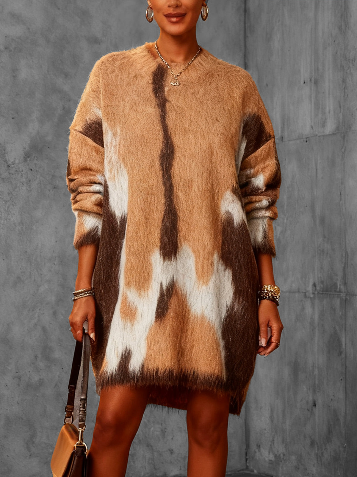 Brown Fuzzy Animal Print Knit Sweater Dress