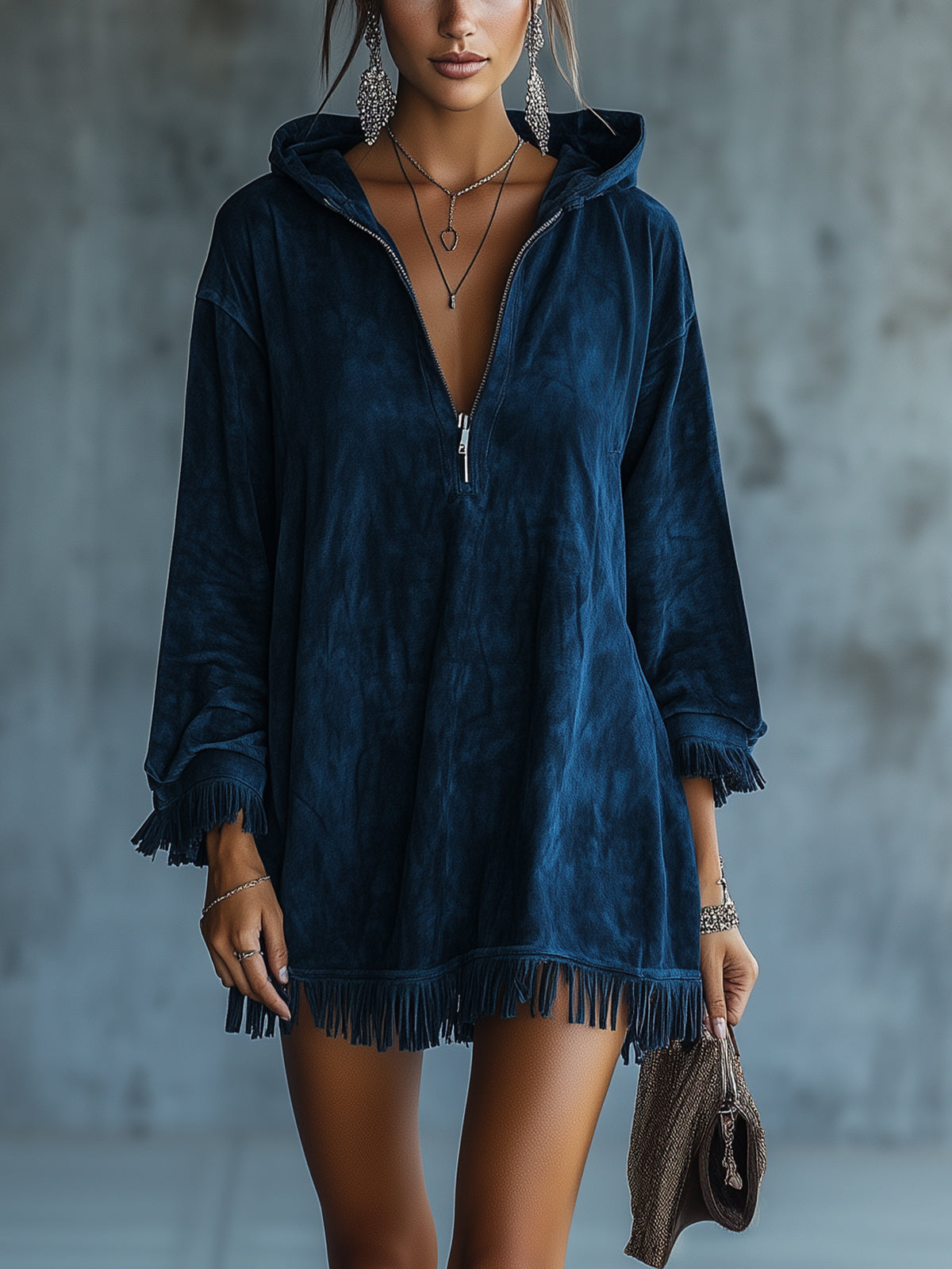 Blue Boho Chic Hooded Fringed Faux Suede Dress