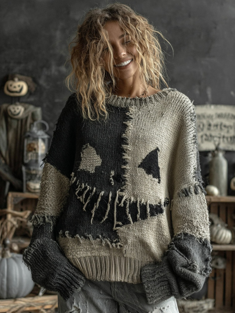 Halloween Spooky Face Colorblock Stitched Cozy Knit Sweater