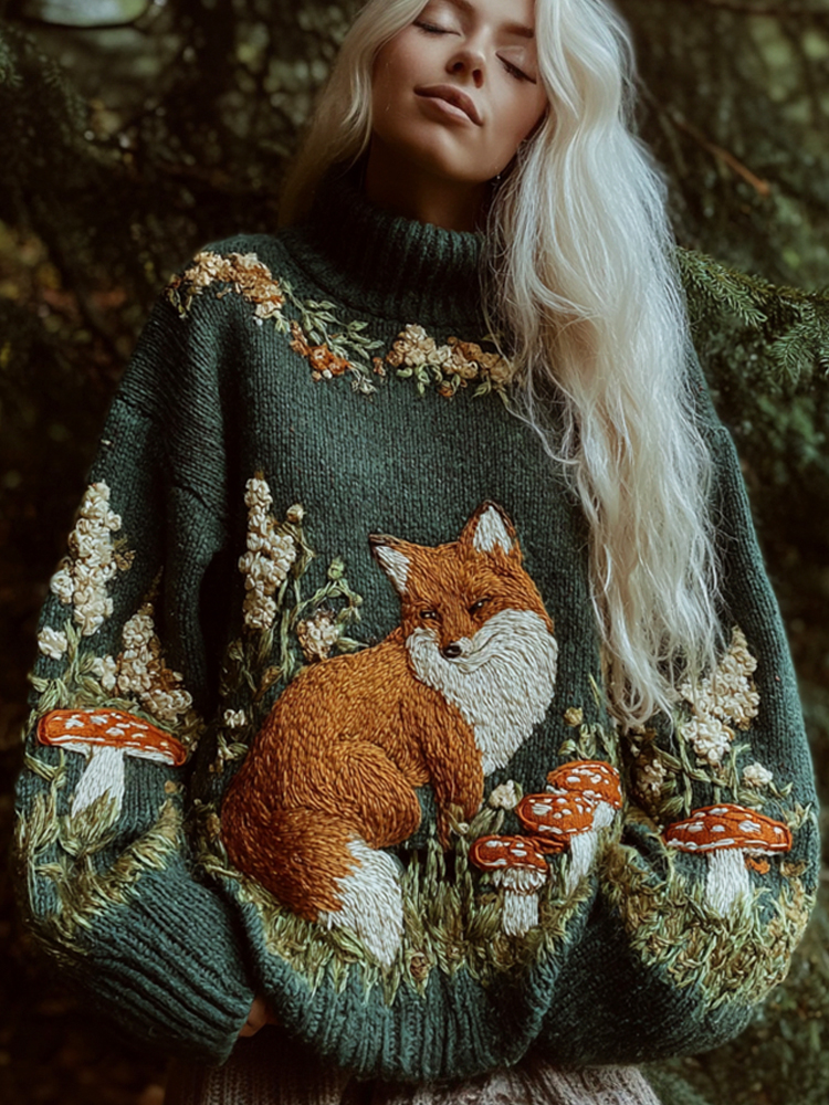 Forest Fox & Mushroom Embroidery Women's Knit Turtleneck Sweater