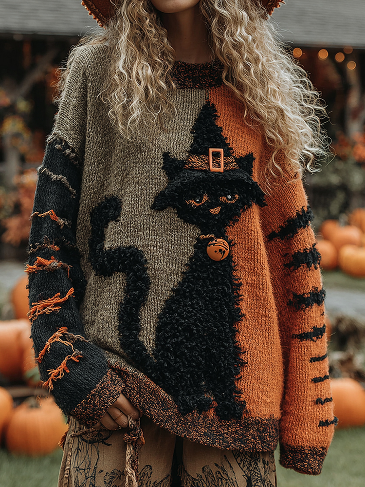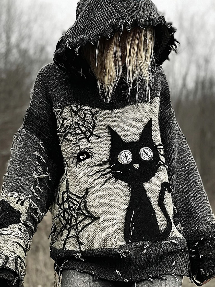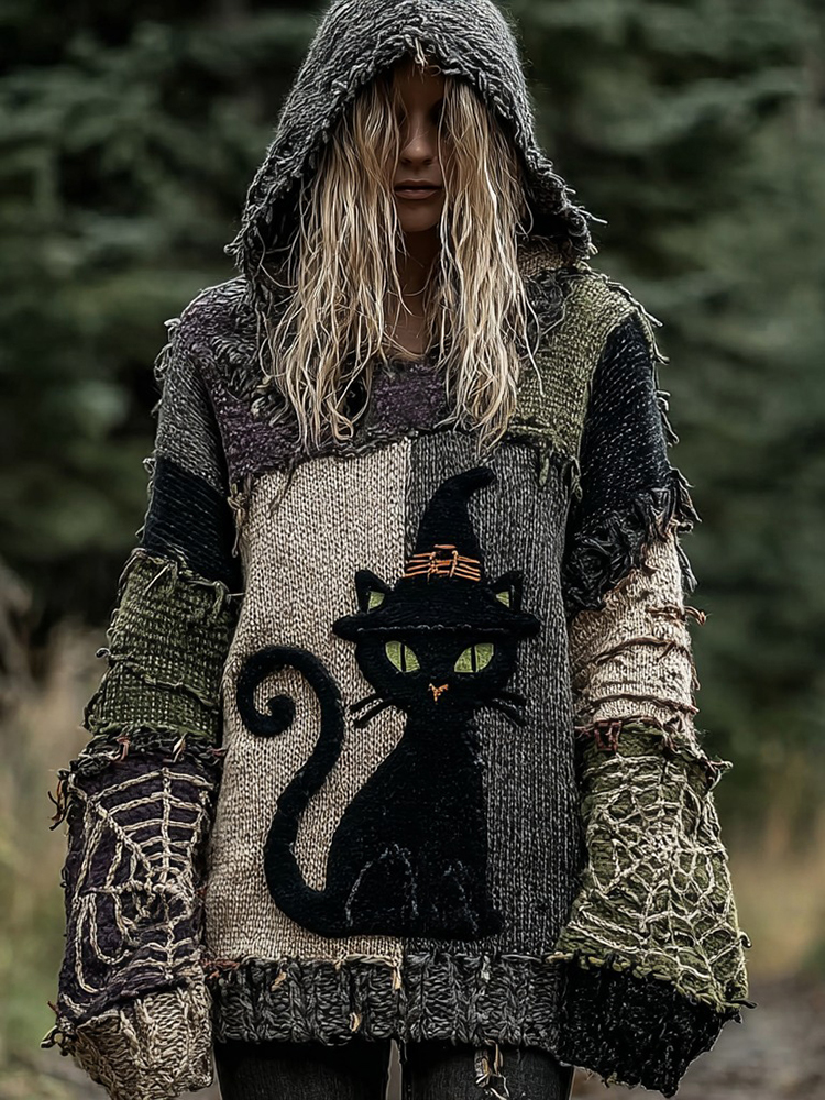 Halloween Scared Black Cat Patchwork Stitched Cozy Knit Hooded