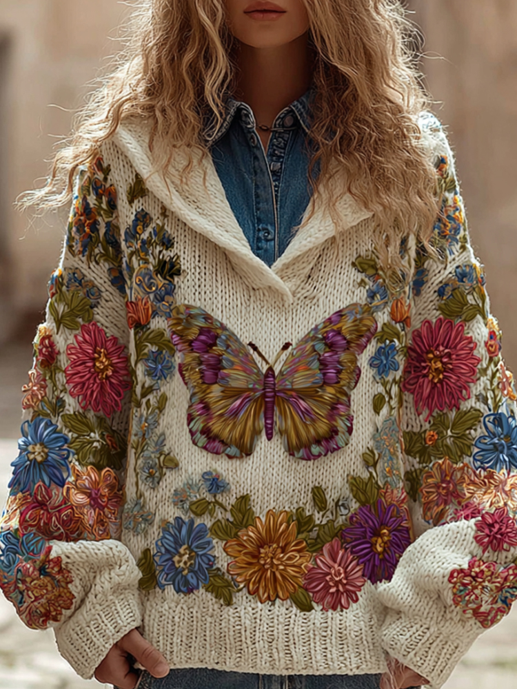 Women's Vintage Multi-colored Butterfly Floral Sweater