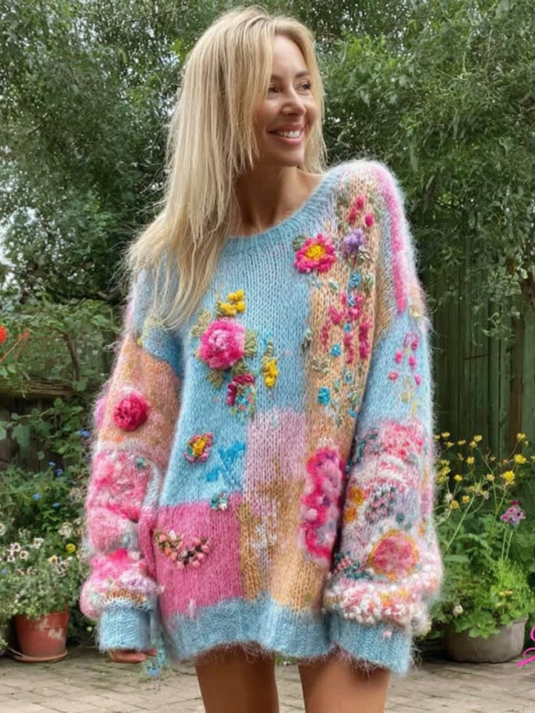 Women's Floral Embroidery Patchwork Art Pullover Cozy Knit Sweater