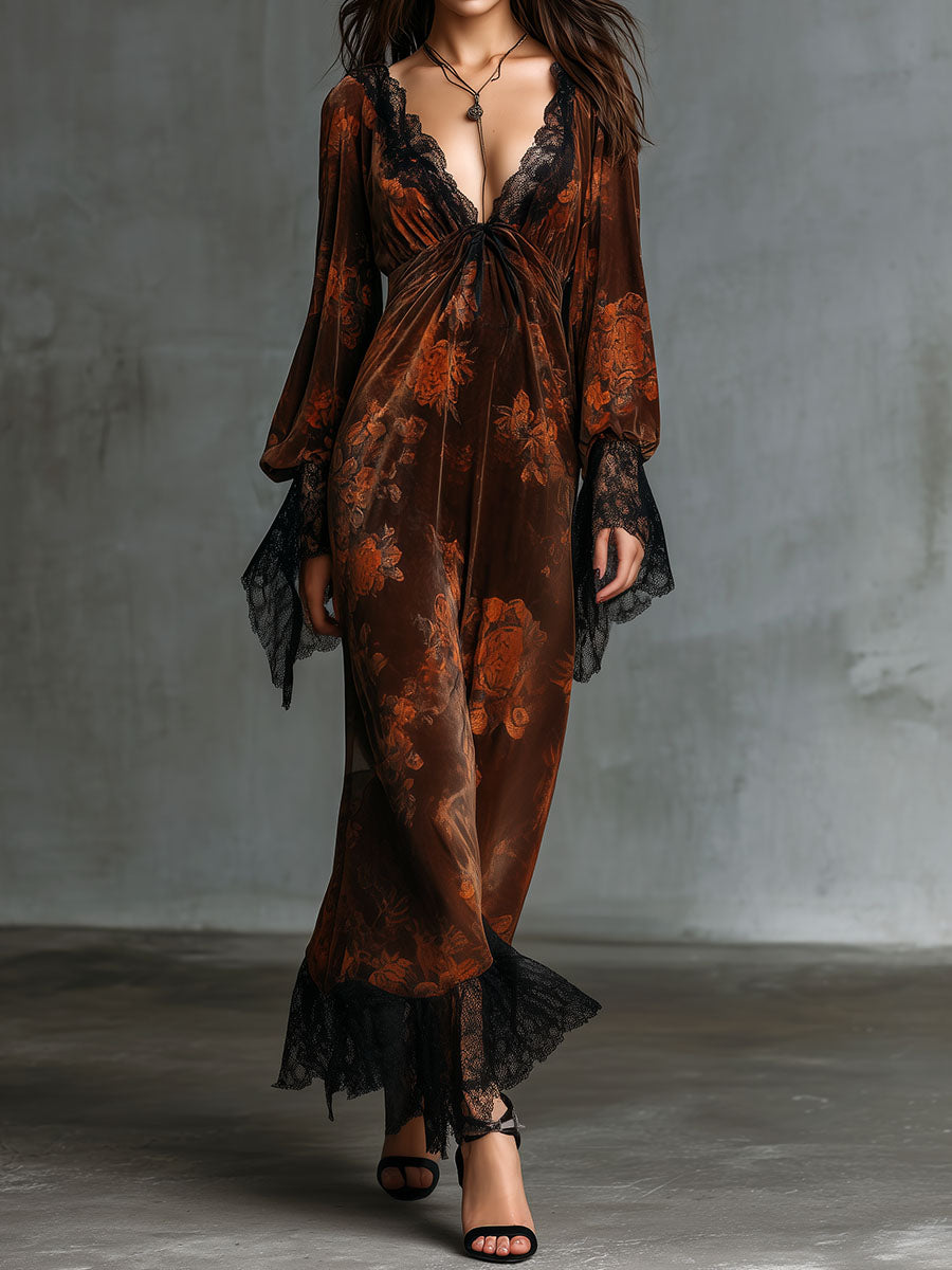 Boho Deep V Neck Floral Print Velvet Gown Dress With Lace Trim