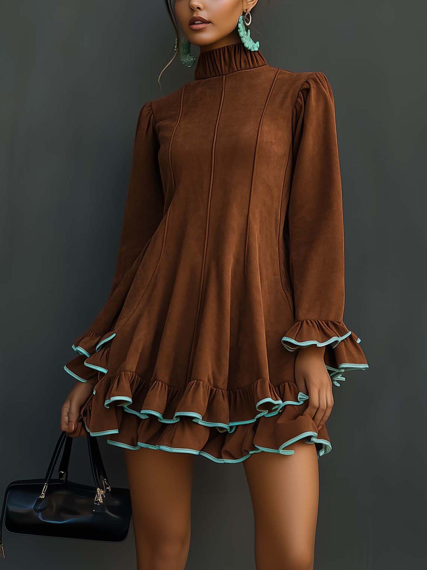 Brown Faux Suede Mini Dress With Mint Green Hem