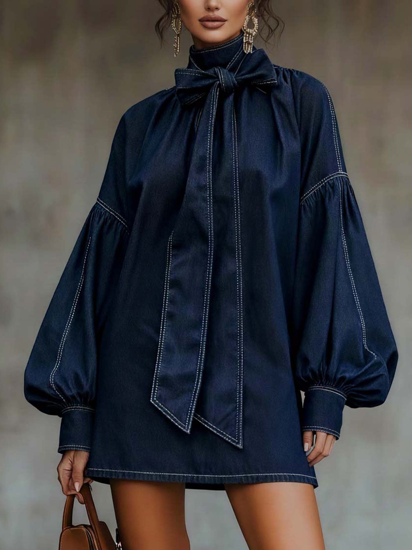 Blue Turtleneck Faux Suede Mini Dress With Tie