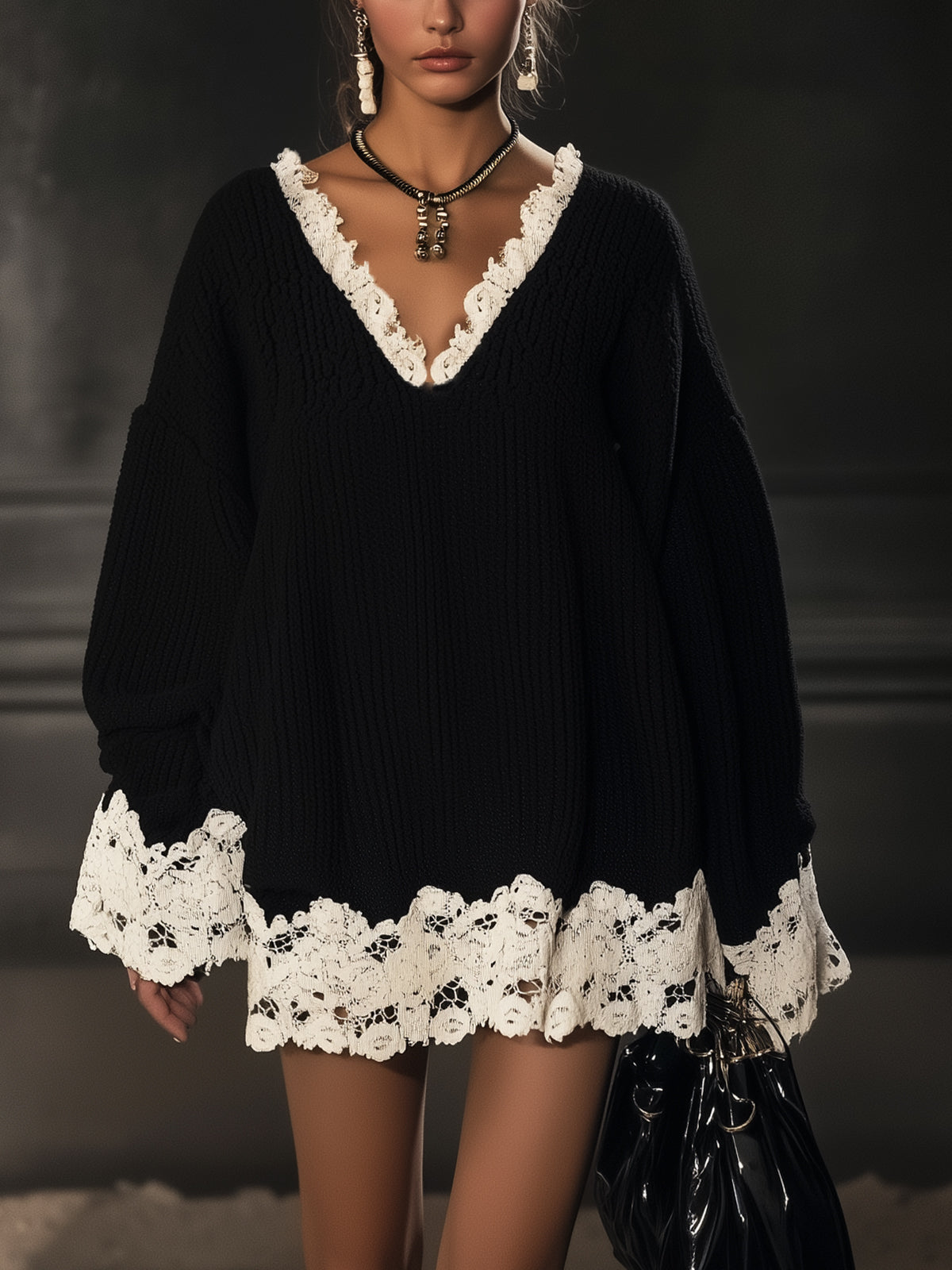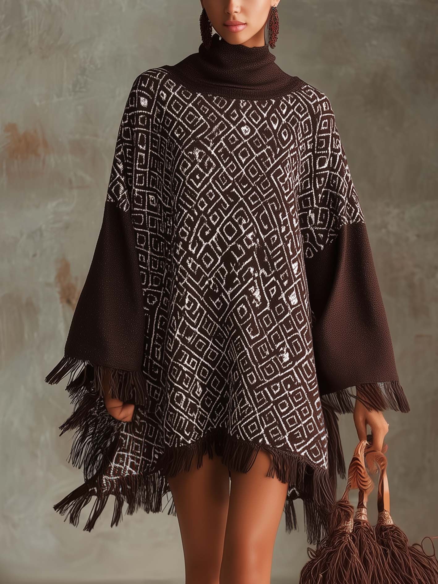 Chocolate Knitted Mini Dress With Retro Geometric Pattern