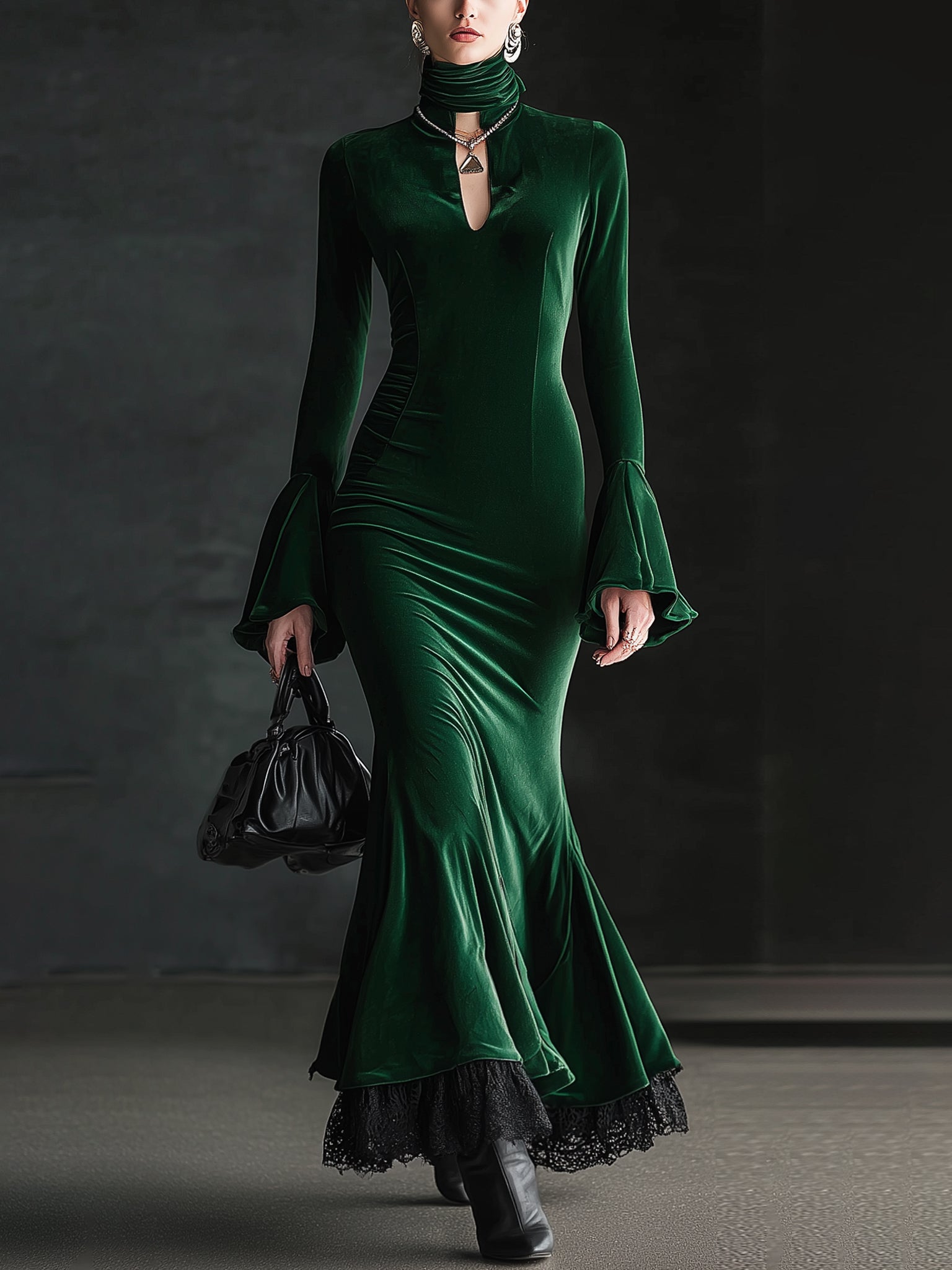 Emerald Velvet High Neck Flare Sleeve Maxi Dress