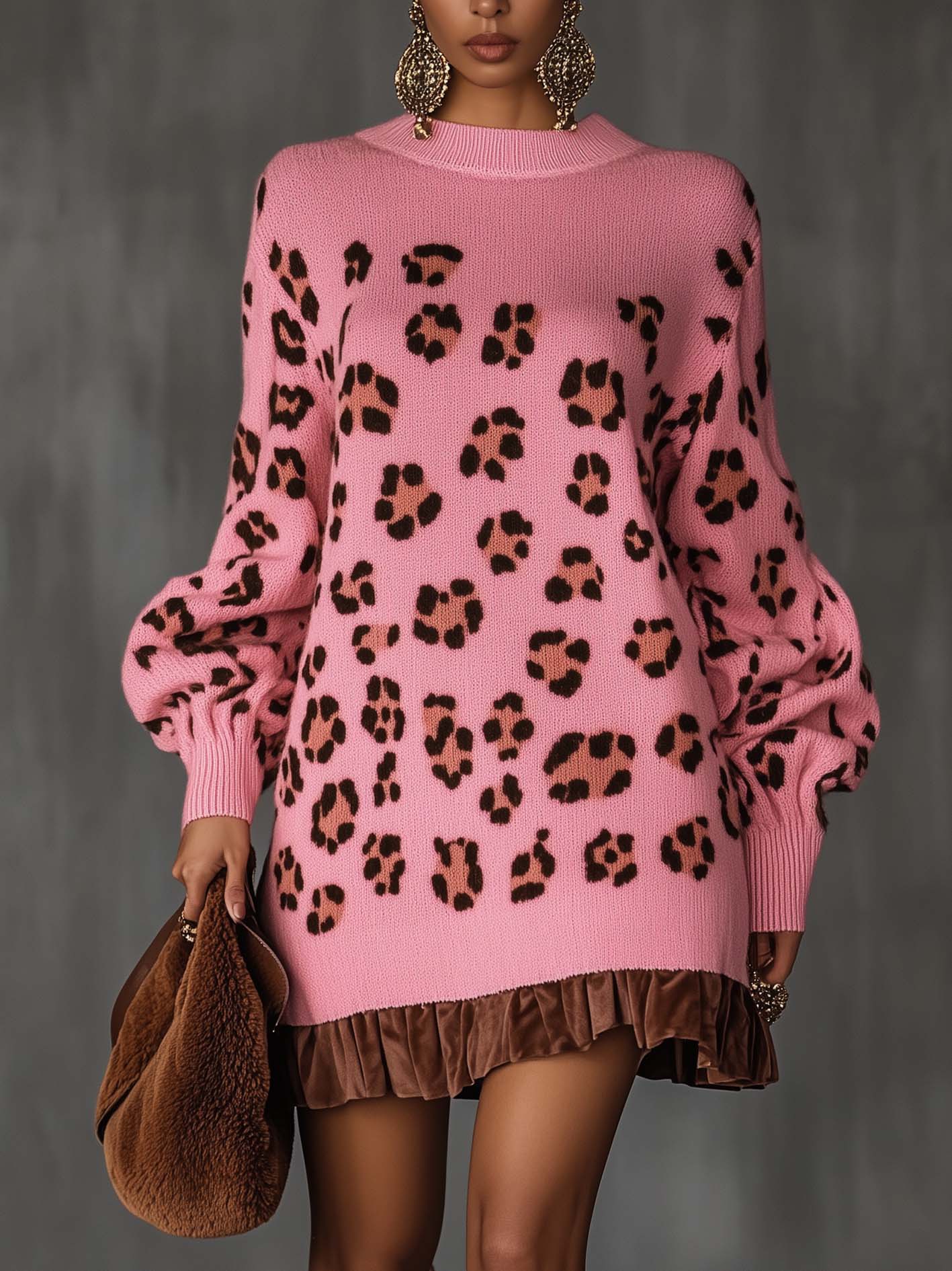 Pink Loose Knit Mini Dress With Velvet Ruffle And Leopard Print