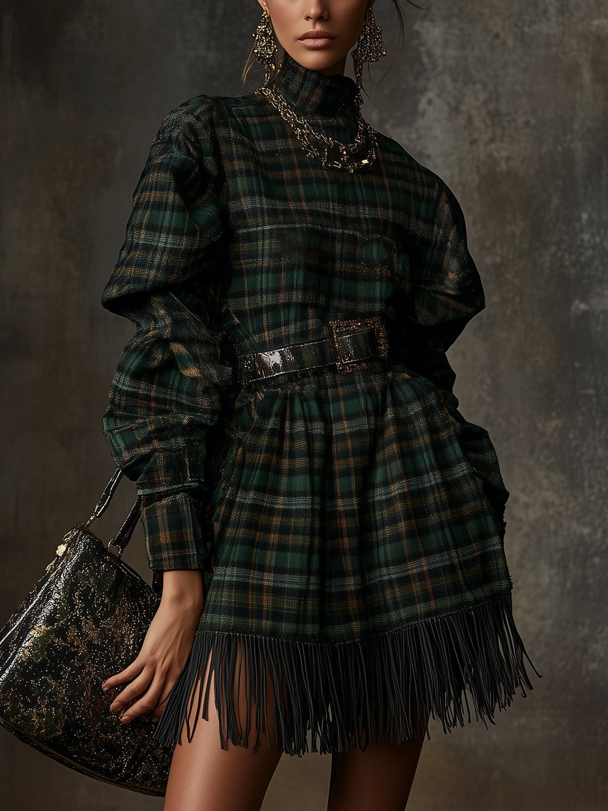 Tartan High-Neck Fringe Hem Mini Dress With Belt