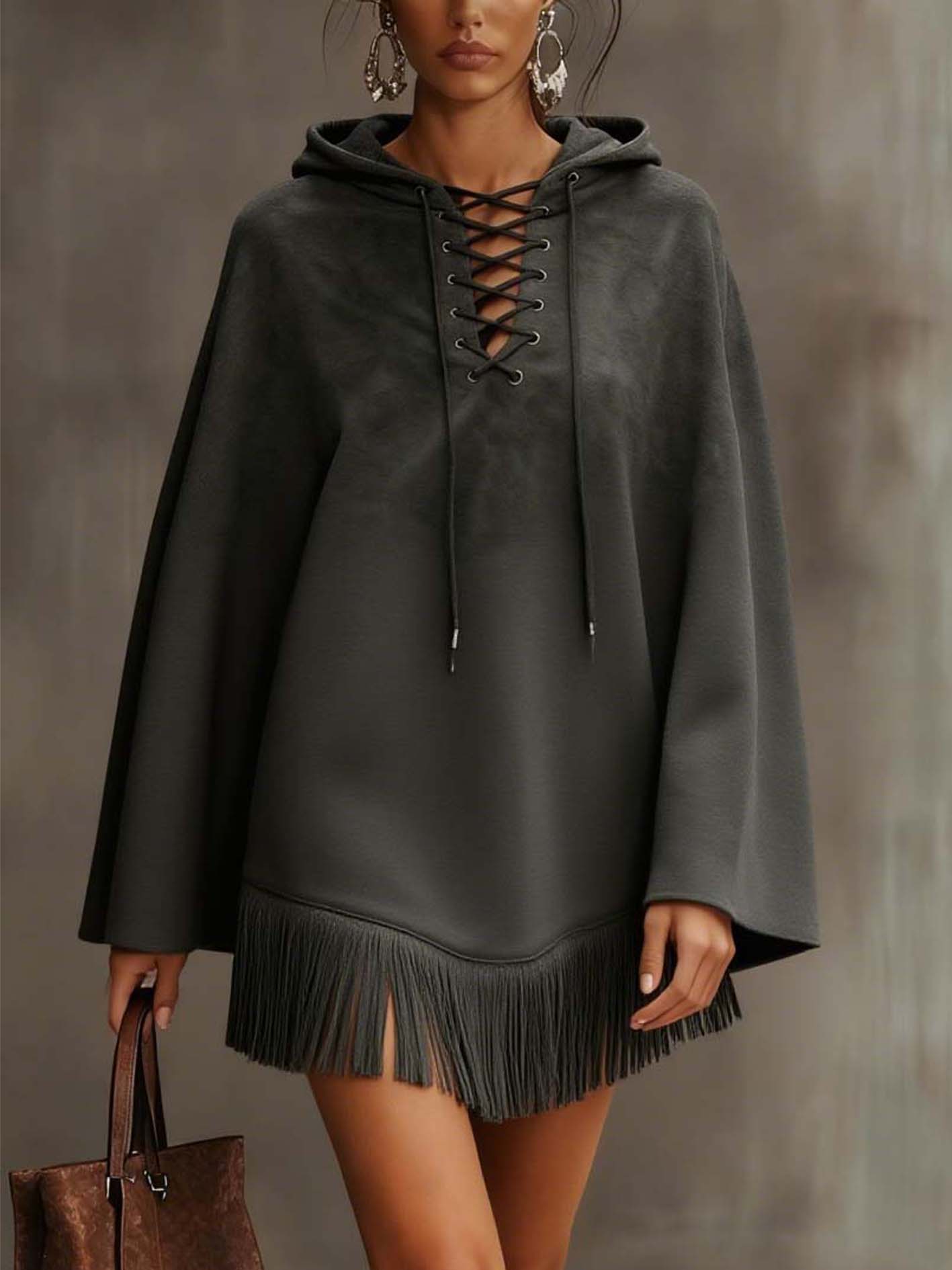 Hooded Charcoal Gray Faux Suede Mini Dress With Tassels