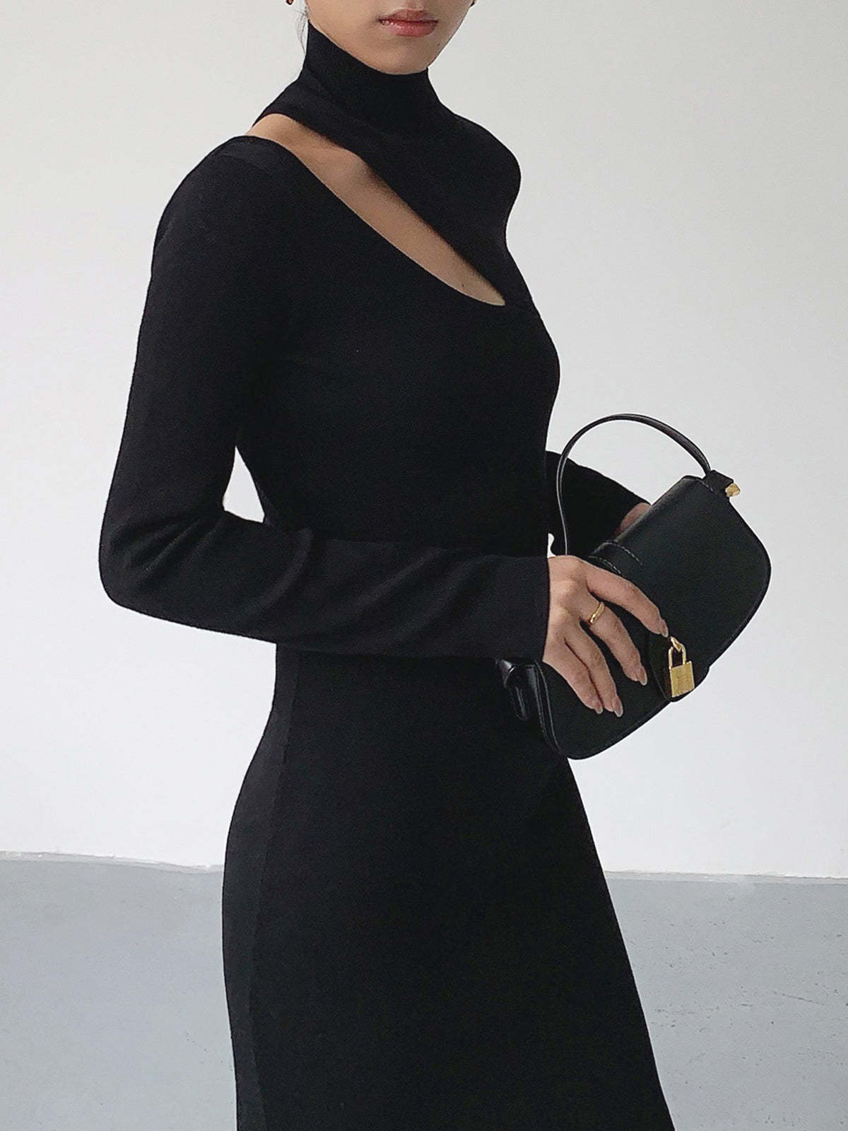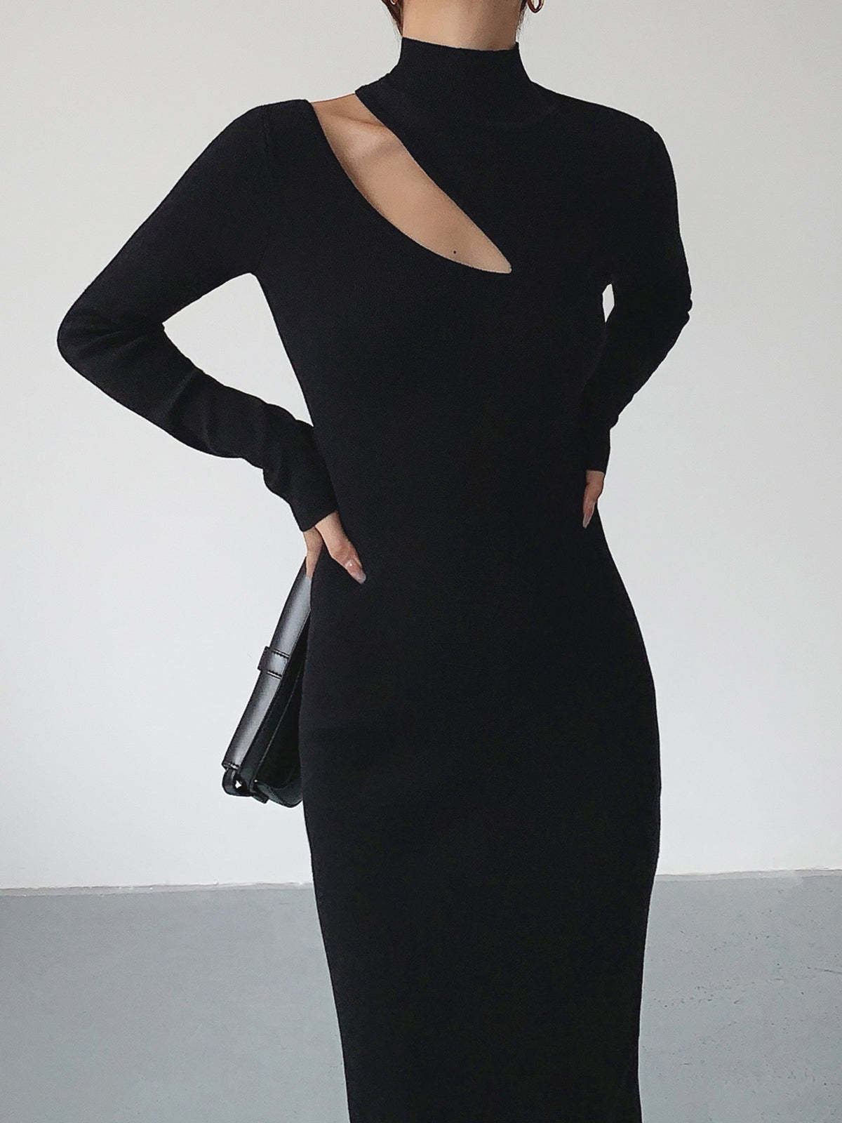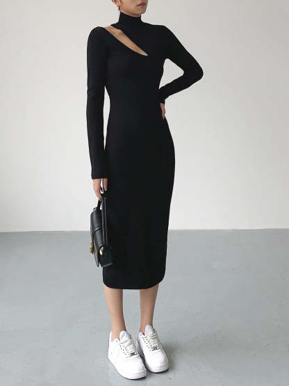 Asymmetrical Cutout Mockneck Knit Midi Dress