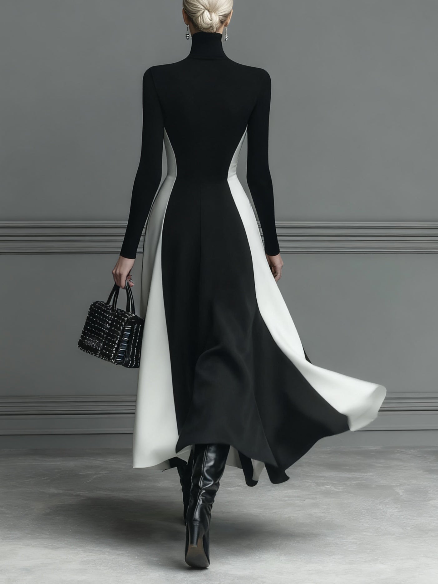 A striking black and white knitted maxi dress with bold stitching, featuring a fluid silhouette for elegant movement.