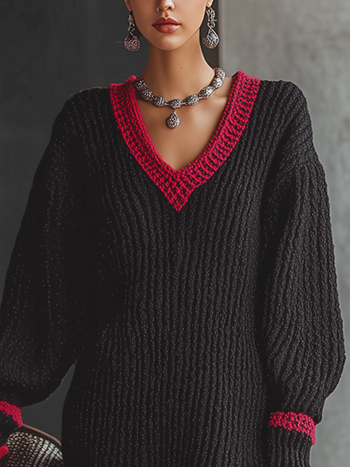 This black knit dress stands out with its vibrant red trim detailing on the V-neck and cuffs, bringing a playful touch to its classic silhouette. The ribbed texture adds depth, while the balloon sleeves introduce a hint of drama.