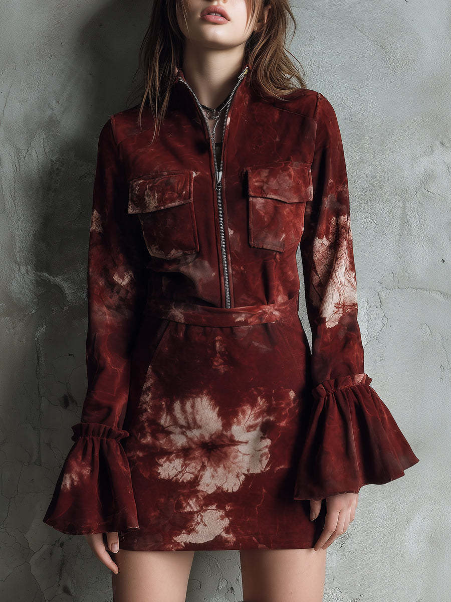 Bohemian Ruffled Cuffs Printed Polyester Suede Mini Dress Product Description