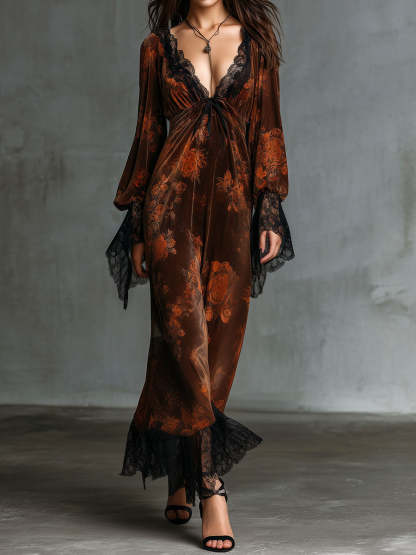 Elegant and versatile, the Boho Deep V Neck Floral Print Velvet Gown Dress with Lace Trim is an ideal choice for those seeking a dress that delivers on both style and comfort. Its intricate detailing and luxurious fabric make it a must-have for your wardrobe, perfect for making a memorable impression.