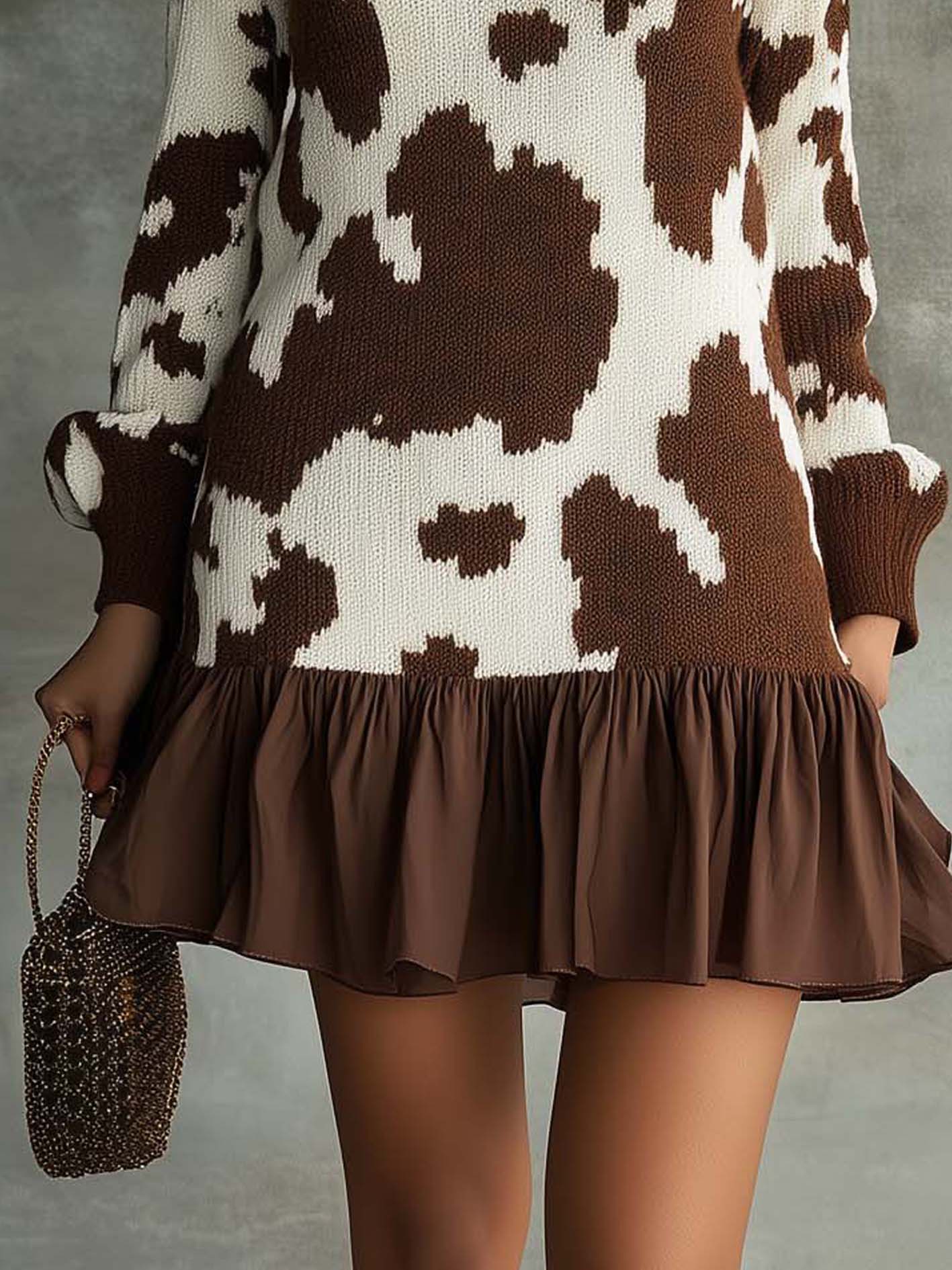 This brown cow-print knitted mini dress blends fun, playful style with a touch of chic femininity. The bold print makes it an eye-catching statement piece, while the soft ruffled hem adds balance and a subtle romantic flair. Its knitted construction ensures warmth and comfort, making it suitable for both style and seasonality.