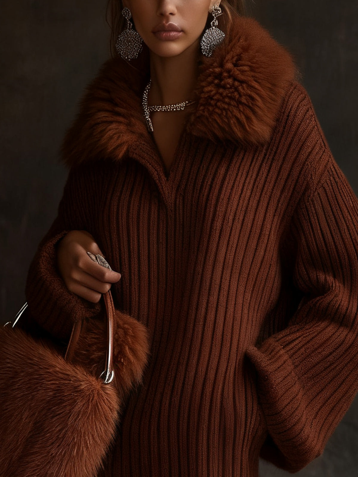 This rust ribbed knit dress is a winter essential that blends style and comfort effortlessly. The faux fur collar adds a touch of opulence, while the ribbed knit texture ensures cozy warmth. It’s a perfect statement piece for your cold-weather wardrobe.