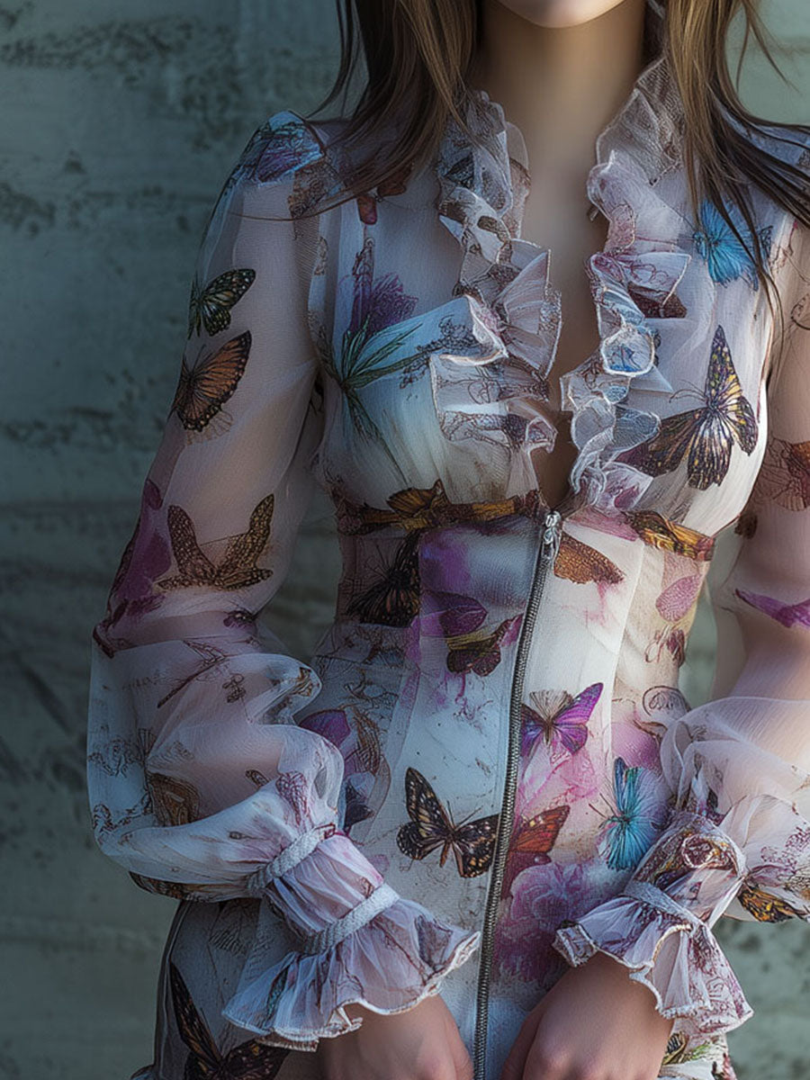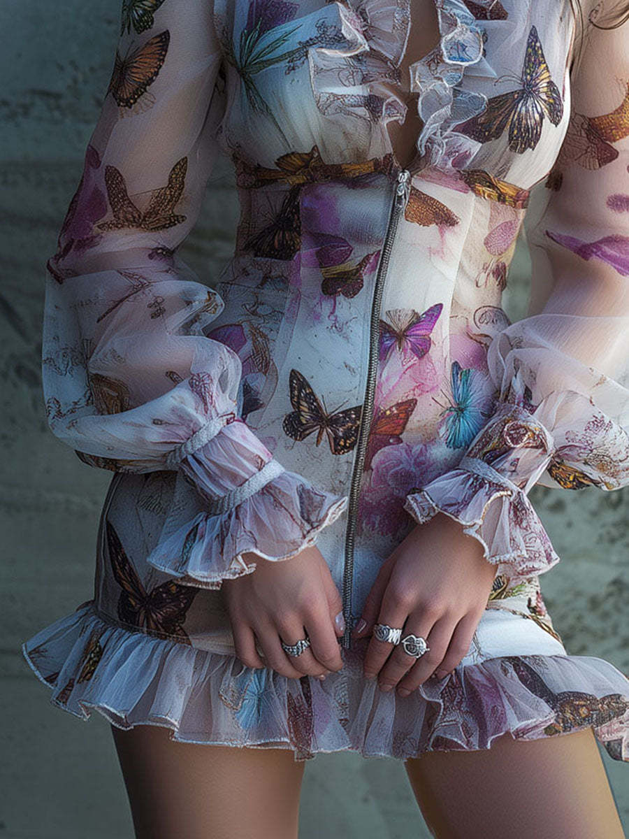 Chic Boho Zip Front Sheer Butterfly Print Ruffle Mini Dress