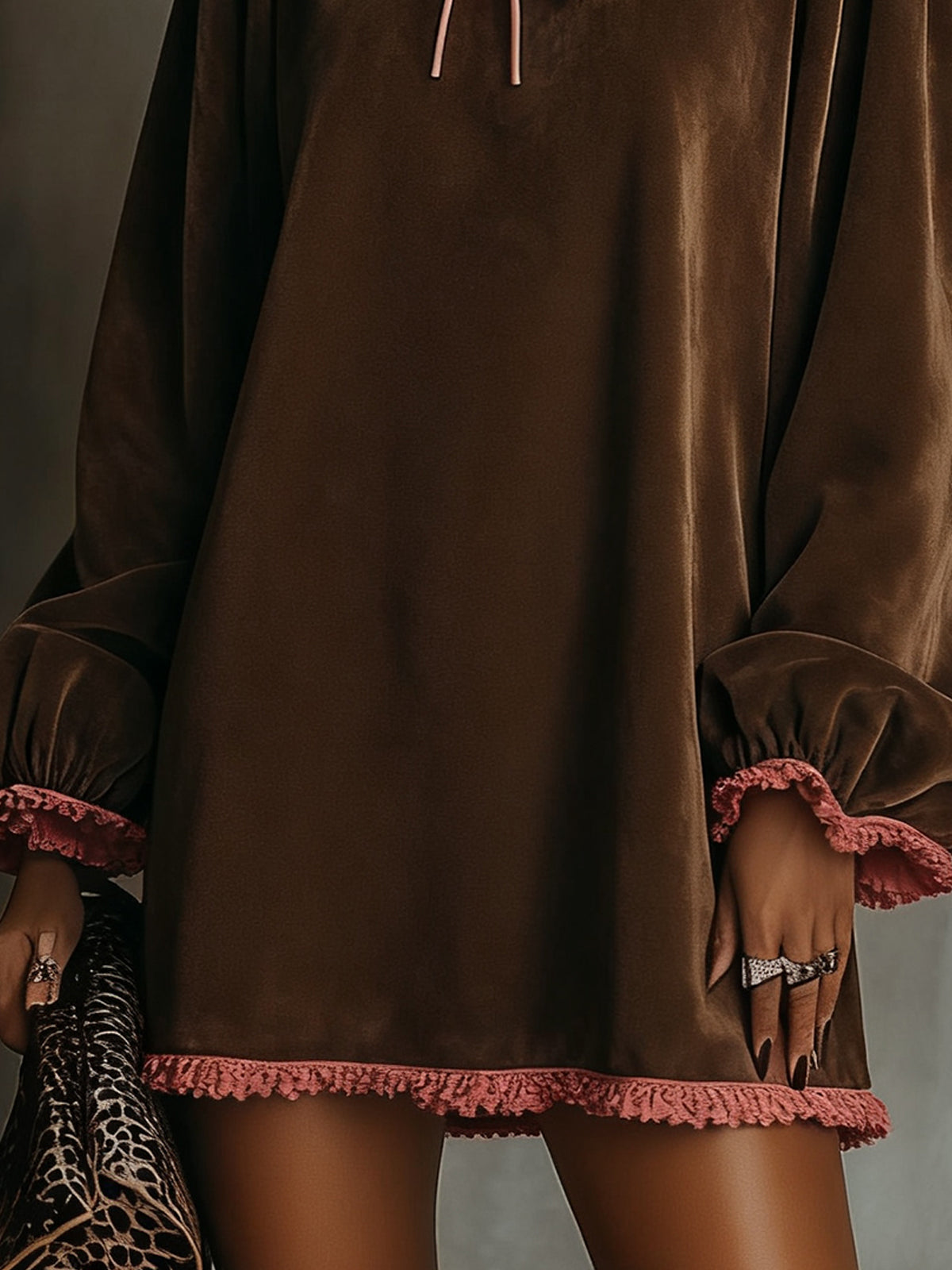 This chocolate velvet dress with pink ruffle trim offers a delightful blend of classic and playful elements. The soft velvet fabric paired with whimsical ruffles creates a captivating look perfect for special occasions.