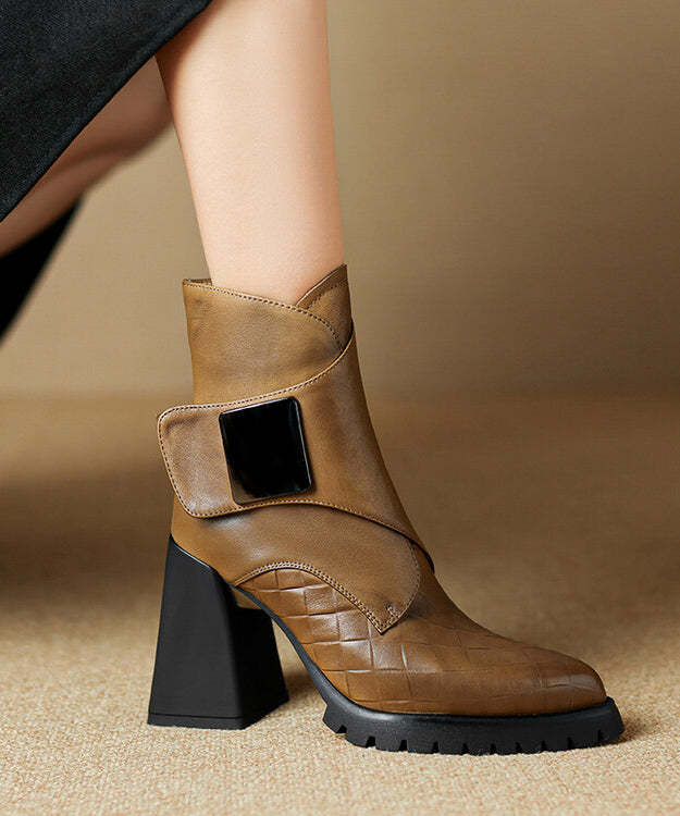Classy Brown Cowhide Leather Chunky Heel Splicing Boots Pointed Toe