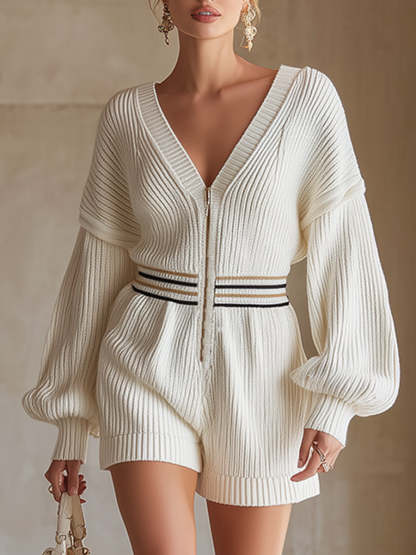 This elegant and versatile cream-white knit long-sleeved jumpsuit with a front zipper is a sophisticated and modern wardrobe essential. The pure cream white hue and flowing lines exude style and are perfect for any occasion. The front zipper adds a modern touch, combining aesthetics and practicality. Made from soft knit fabric, this jumpsuit ensures a comfortable and flattering fit, highlighting your natural figure.