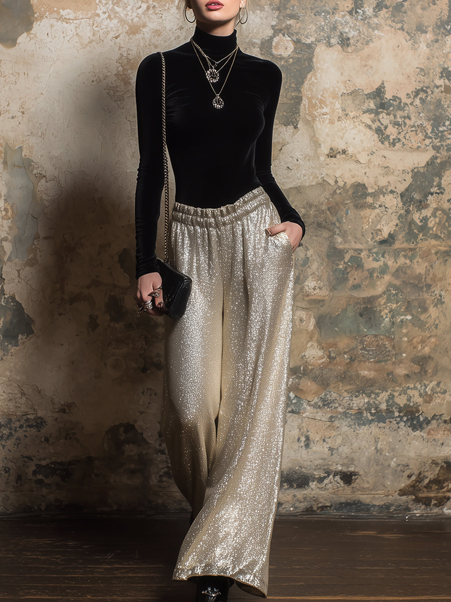This elegant suit features a sophisticated black velvet top and stunning light gold wide-leg trousers. The skillful fusion of materials and colors creates a modern and stylish look, perfect for any occasion.