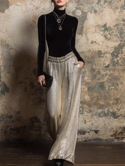Pair it with heels or elegant flats to accentuate your refined taste. Delicate gold jewelry complements the light gold wide-leg trousers perfectly. A small clutch adds a touch of elegance. This elegant black velvet top and light gold wide-leg trouser suit is ideal for those who seek a unique style. The perfect blend of luxurious fabrics and modern design ensures you stand out confidently and gracefully in any setting.