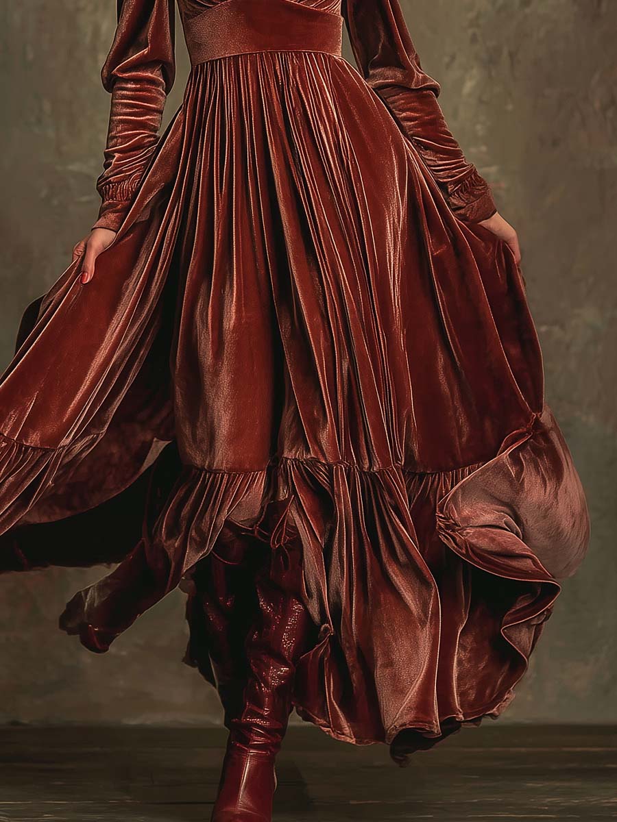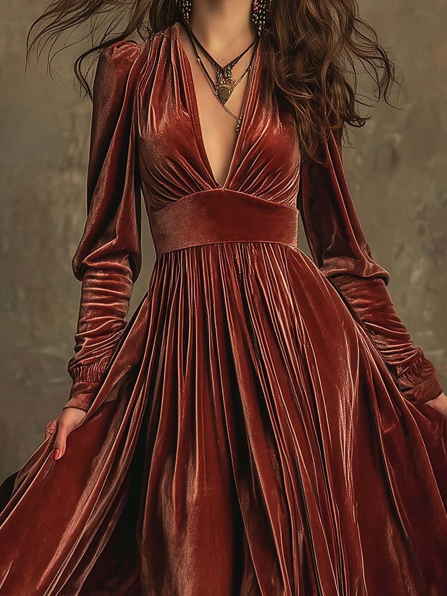 Overall, the Elegant Bohemian Velvet Maxi With Draped Silhouette stands as a versatile and timeless piece that combines texture, style, and versatility. Its luxurious fabric and bohemian-inspired design make it an ideal choice for anyone looking to make a statement with their fashion.