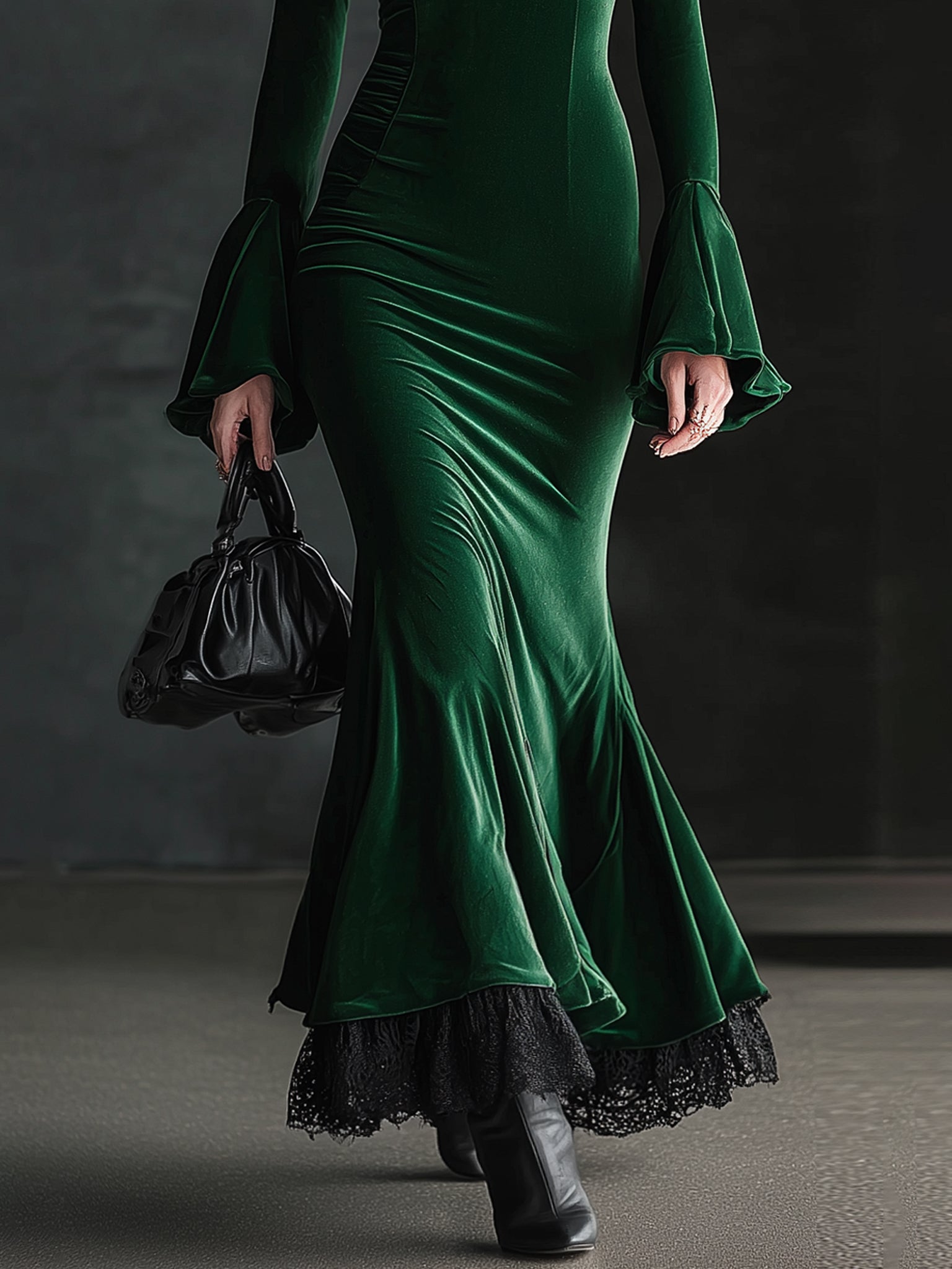 - Material: Crafted from luxurious emerald green velvet, the dress exudes elegance and richness with a silky-soft texture and a subtle sheen that enhances every movement.
