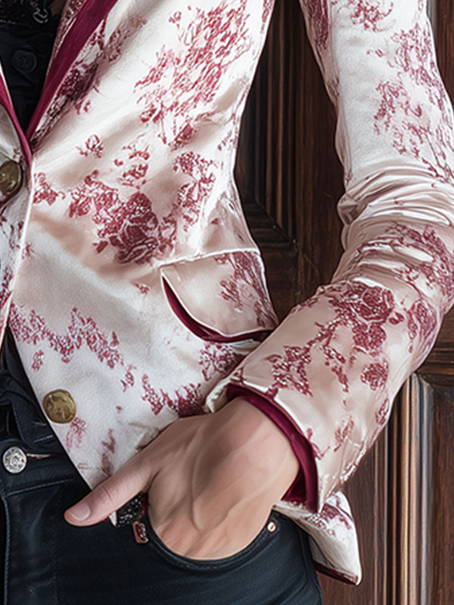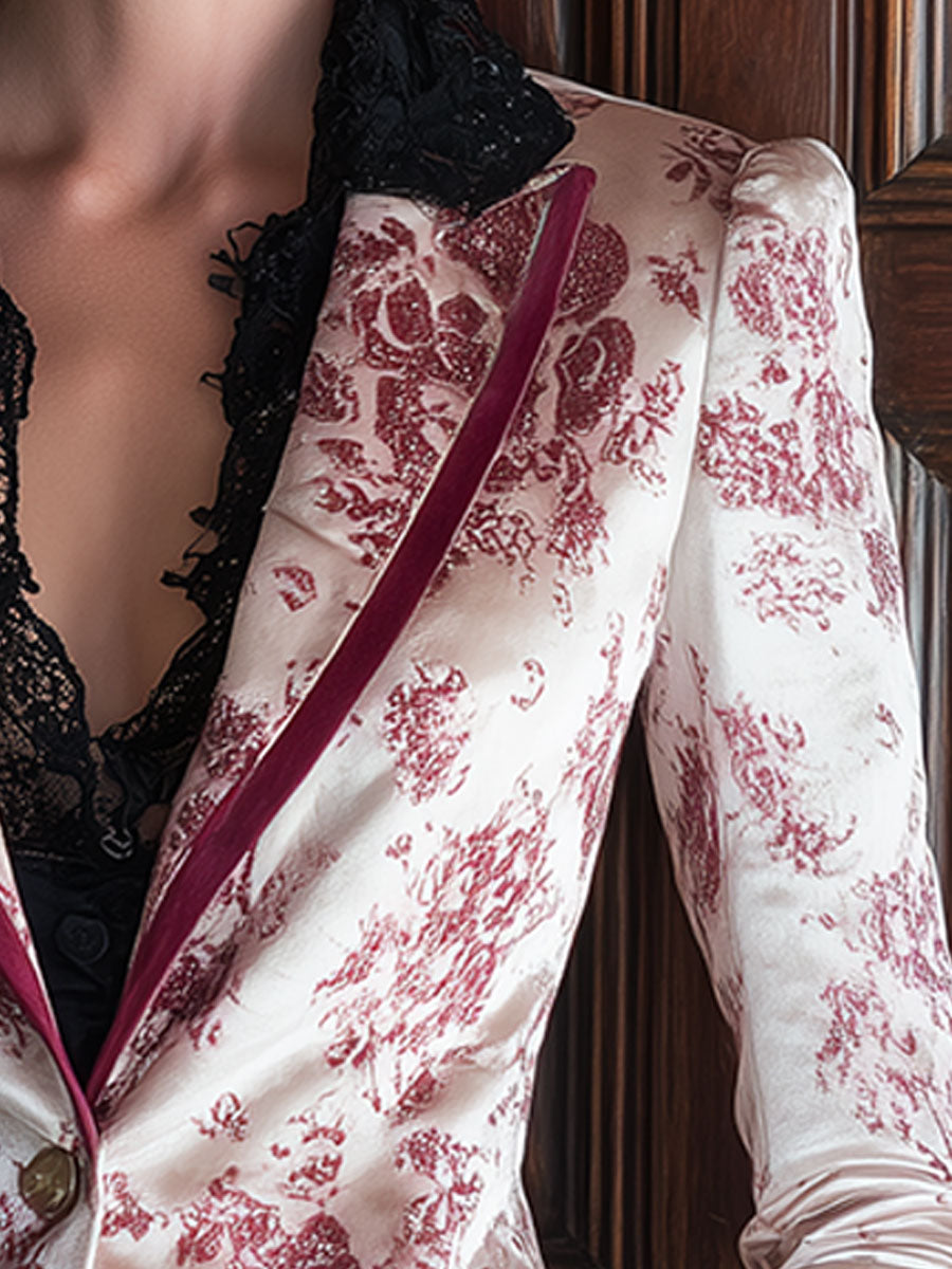 The Exquisite Retro Red Print White Velvet Blazer is a stunning piece that marries the luxurious feel of velvet with the boldness of a vibrant print, making it a standout addition to any wardrobe. This blazer features a rich red print set against a backdrop of plush white velvet, creating a striking contrast that captures both attention and admiration. The intricate pattern, reminiscent of classic retro designs, infuses the blazer with a sense of nostalgia while maintaining an air of modern sophistication. The velvet fabric adds a tactile element of opulence, offering both warmth and a refined sheen that enhances the overall aesthetic.