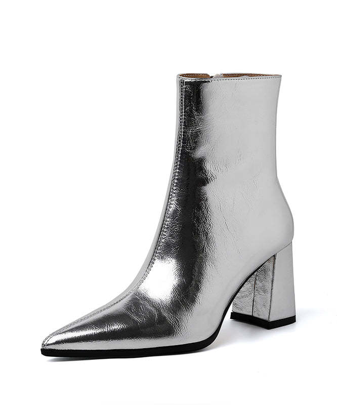 French Splicing Chunky Boots Silver Cowhide Leather Pointed Toe