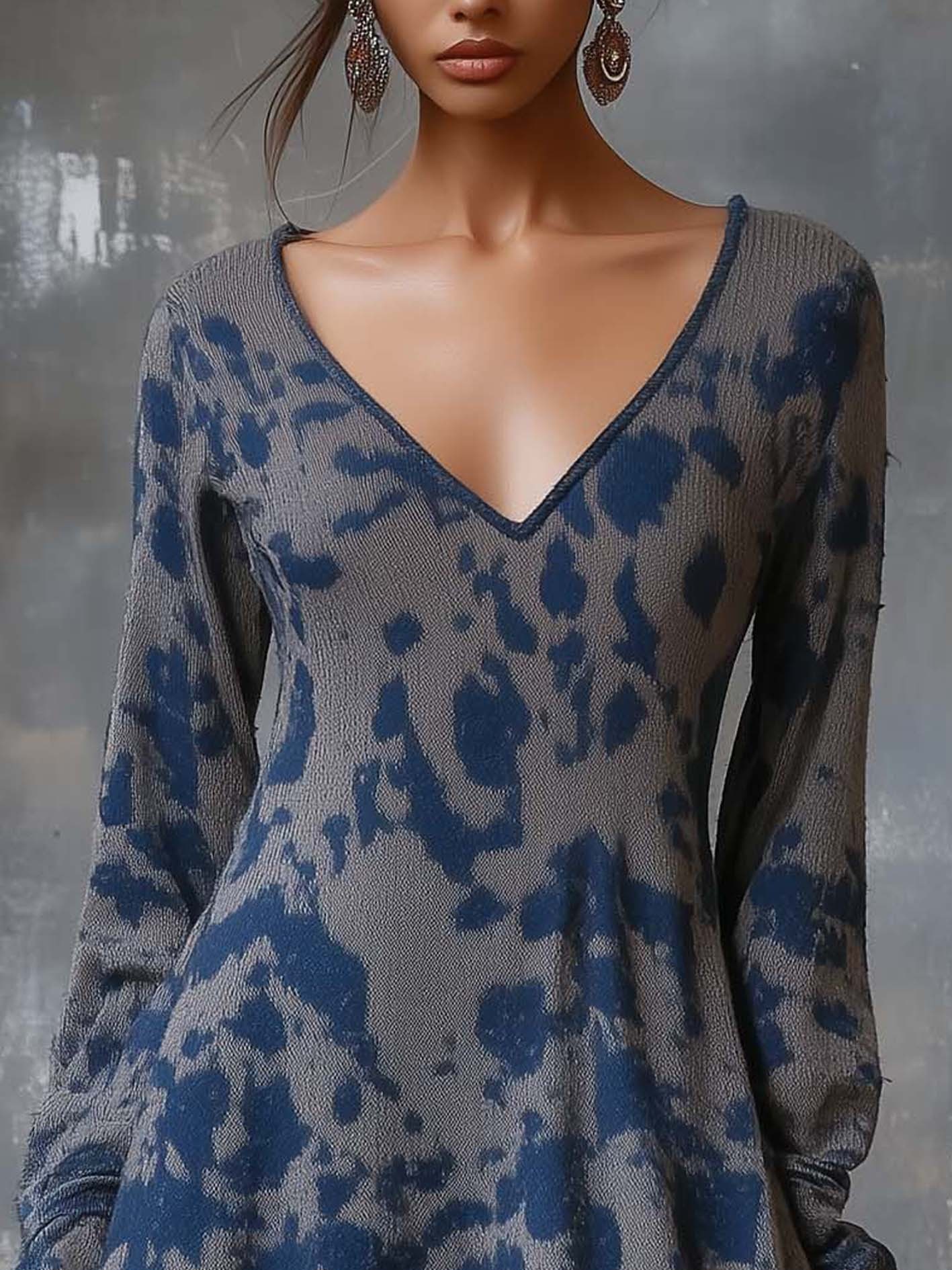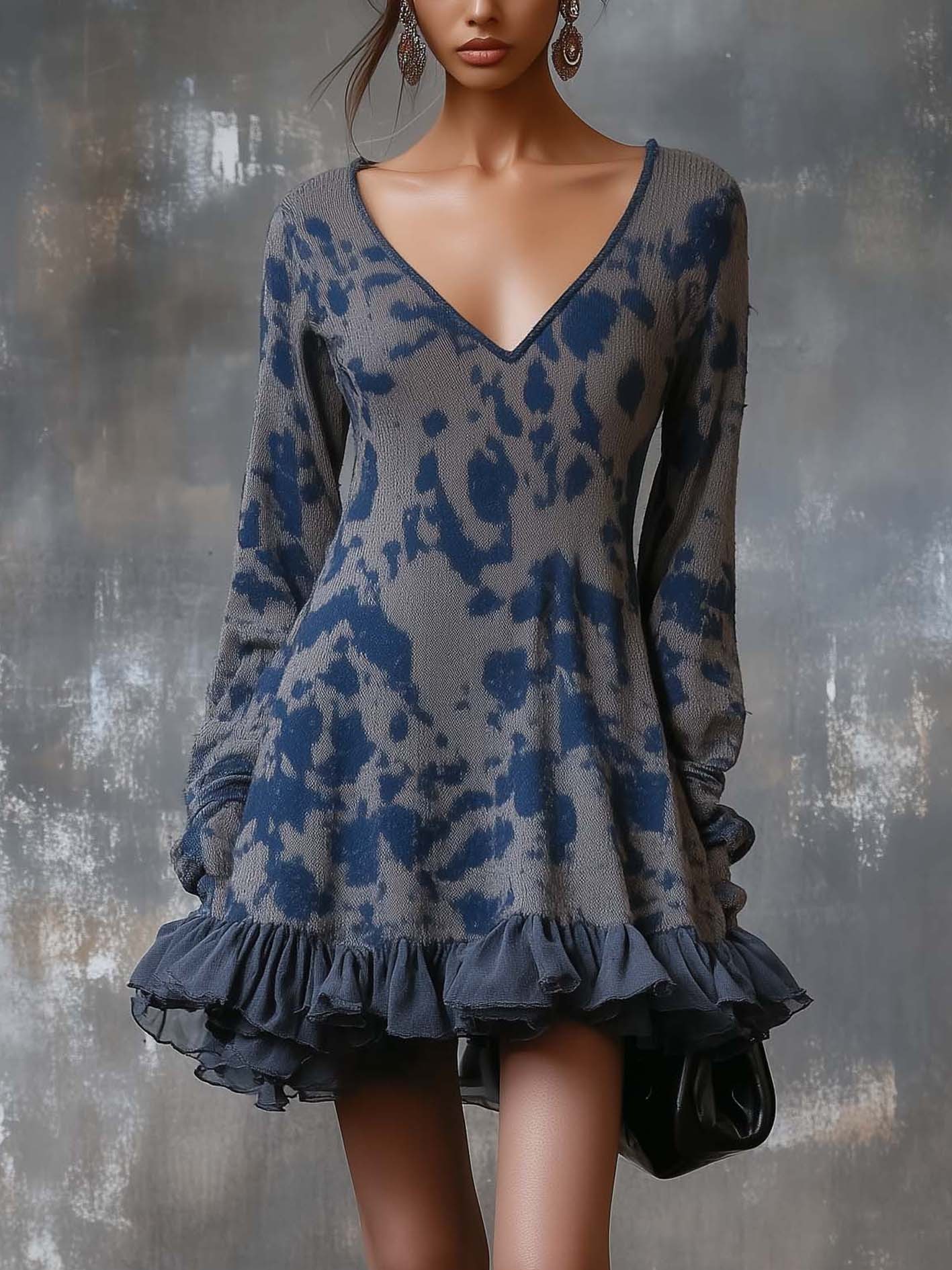 This mini dress blends casual comfort with chic details. The knit base ensures softness and warmth, while the bold dark blue camouflage print adds edge and modernity. The chiffon ruffles at the hem soften the look, creating a feminine contrast against the structured knit. The V-neckline elongates the neckline and balances the long sleeves, making it versatile and flattering.