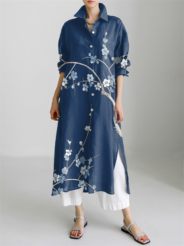 Japanese Art Flower Print Long Sleeve Slit Shirt Dress