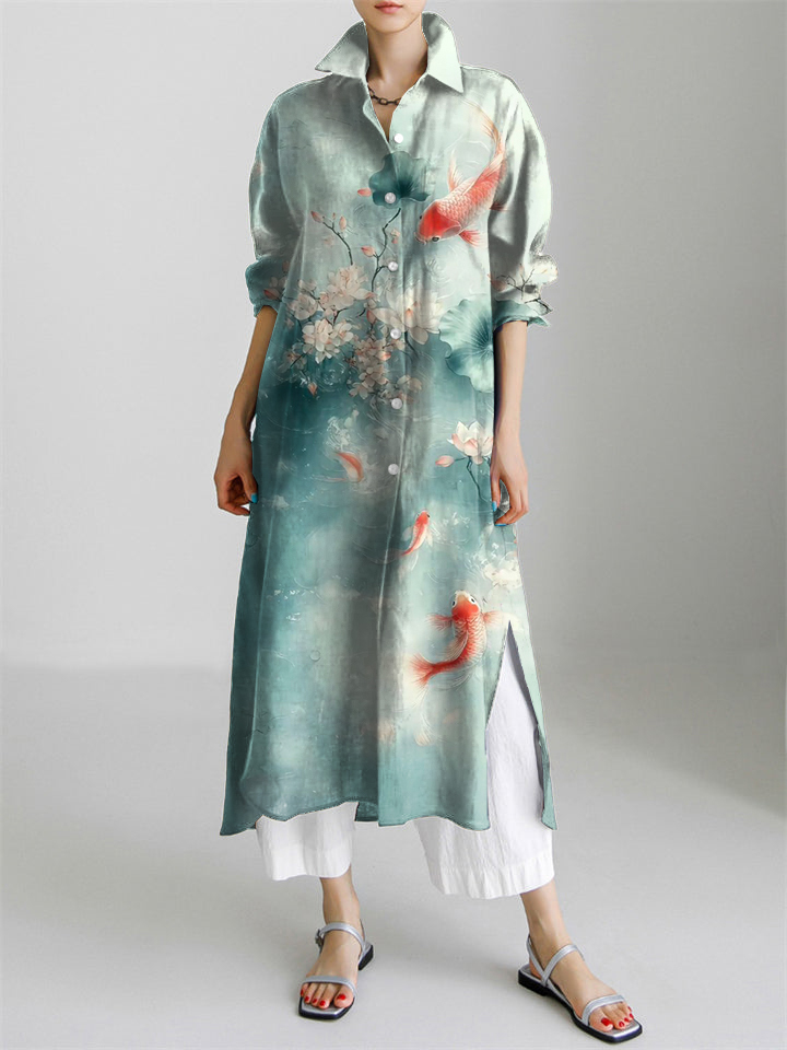 Japanese Art Koi Fish Print Long Sleeve Slit Shirt Dress