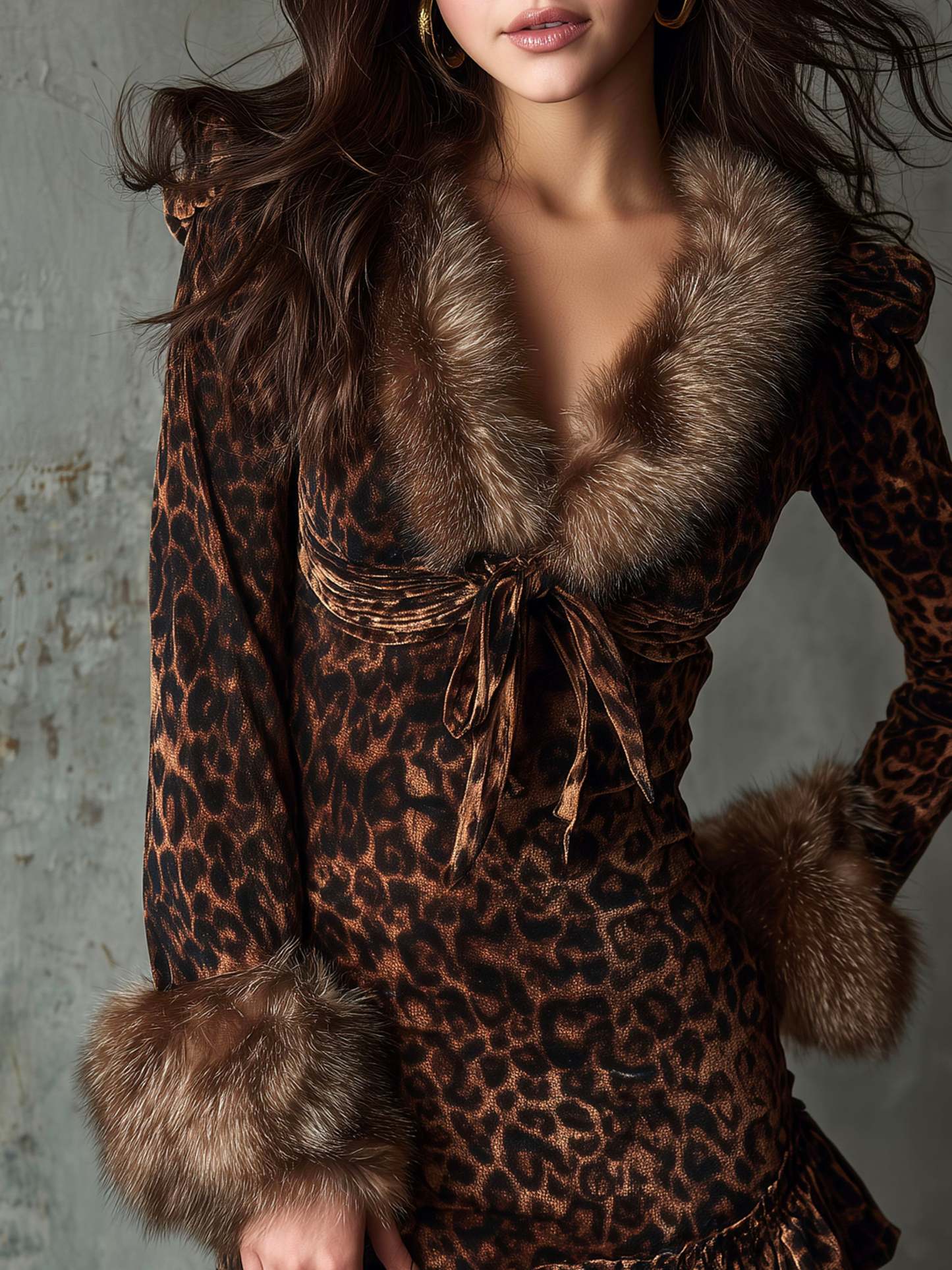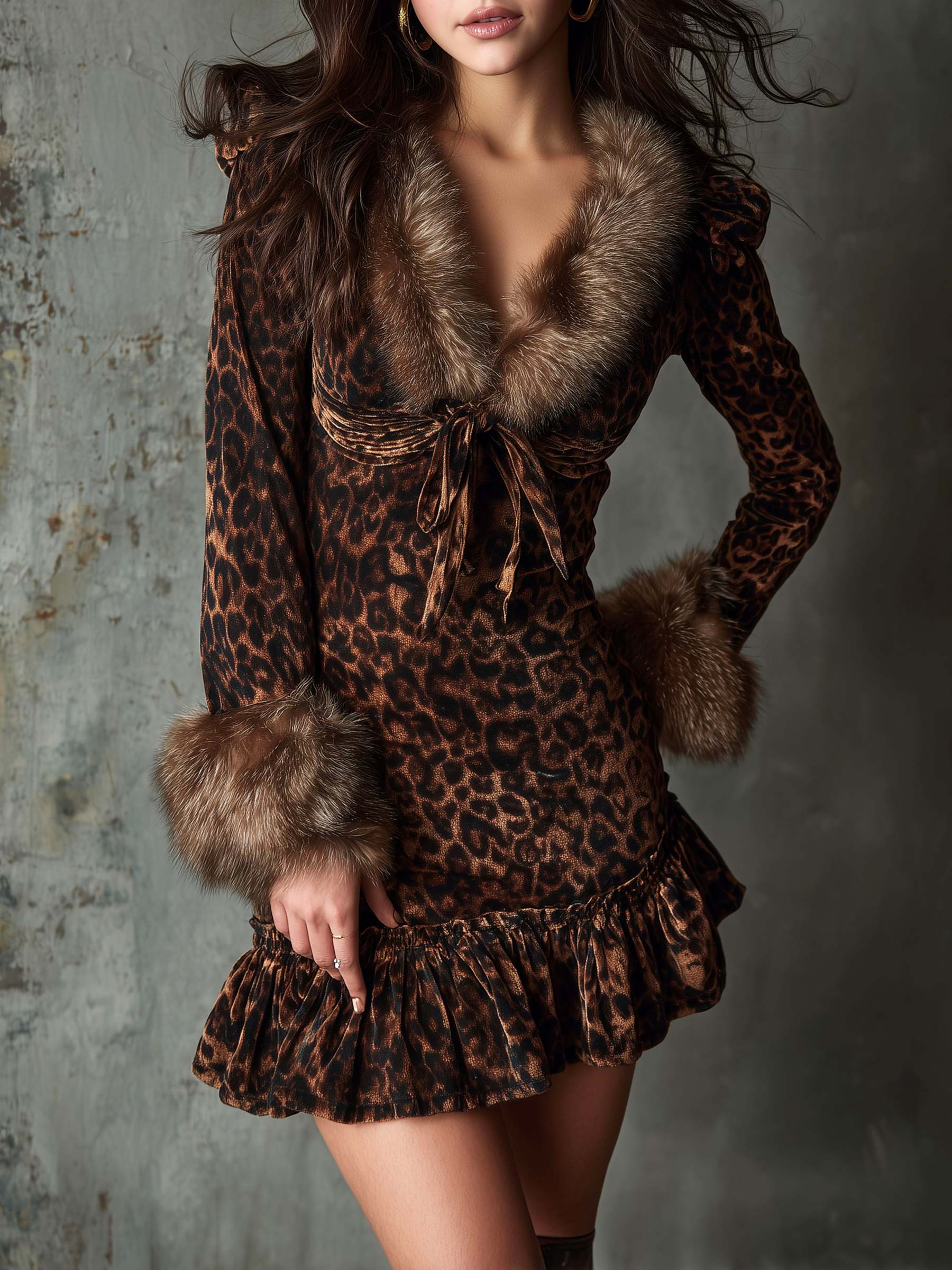 The Leopard Pattern Velvet Ruffled Hem Mini Dress with Eco Fur Collar and Cuffs is a statement piece that seamlessly blends classic animal print with luxurious materials. Whether for a night out or a special occasion, this dress ensures you step out in style and confidence.
